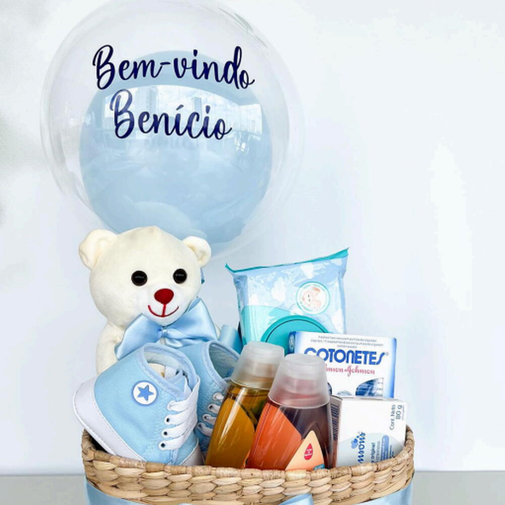 balão p personalizado - 1 un. sabonete - 1 un. cesto - 1 un. pelúcia p - 1 un. sapatinho - 1 un. cx cotonete johnson - 1 un. pct. lenço umedecido - 1 un. shampoo e condicionador - 1 un.