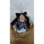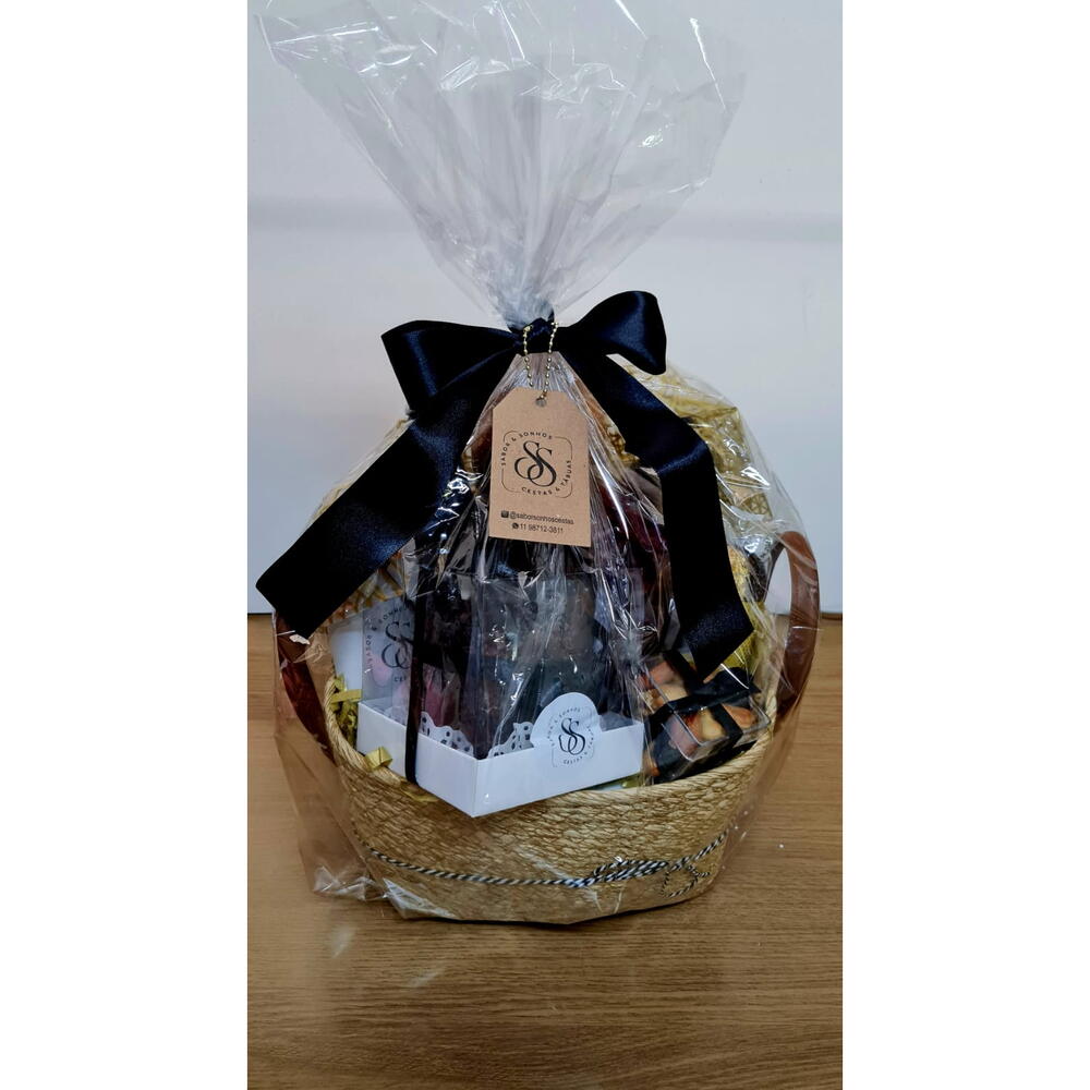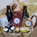 cartão com mensagem - 1 un. cerveja premium (baden baden ou equivalente) - 2 un. peça de queijo provolone aprox 175 gr - 1 un. stropwaflle - 1 un. salame premium fatiado 100 gr - 1 un. trio de bombom ferrero roche - 1 un. pote de nuts aprox 50 gr - 1 un. baguete rustica calabresa 140 gr - 1 un. cesta rustica decorada - 1 un.