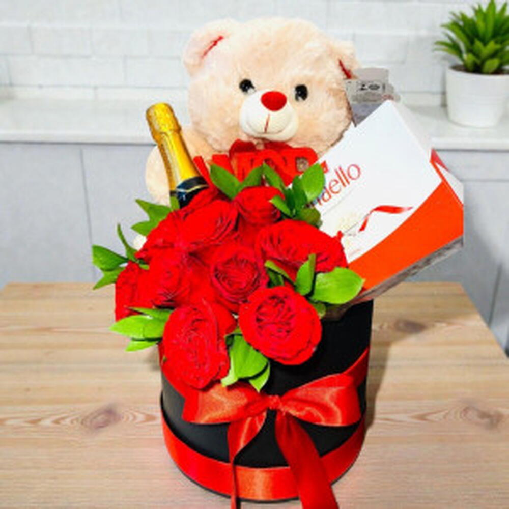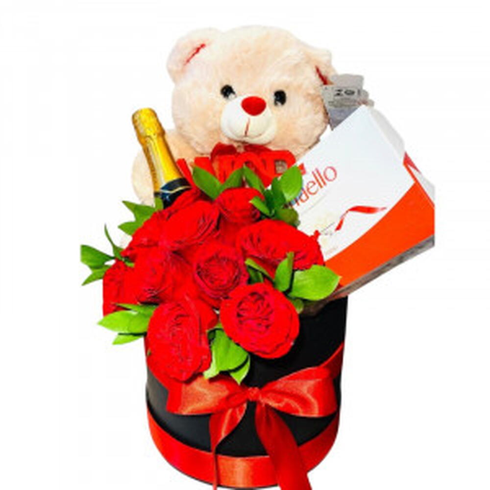 caixa box cartonada para viagem - 1 un. buquê com 15 rosa - 1 un. mini espumante chandon - 1 un. caixa de chocolate raffaello - 1 un. urso médio - 1 un.