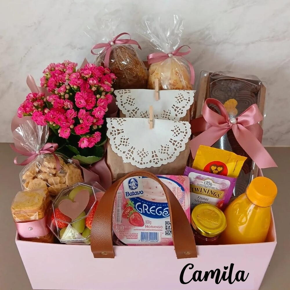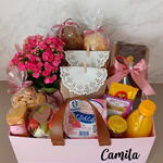 Box sacola personalizada com nome, contendo uma Kalandiva rosa, bolo de cenoura com cobertura, pães de queijo, baguete, croissant, iogurte grego, torradinhas, biscoitos, brigadeiros, sachês de drip coffee e chá importado, suco natural de laranja e achocolatado.