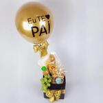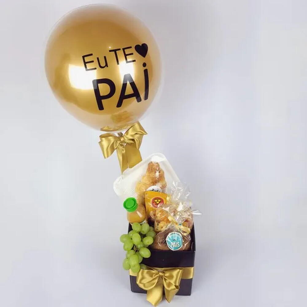 1 suco - 180 ml pães de queijo - 4 un. croissant grande - 1 un. porção de uva - 1 un. porção de cookies - 1 un. balão temático de dia dos pais - 1 un. capuchino - 1 un. box cartonada ornamentada com laço e fita de cetim - 1 un. saco transparente de celofane e laço para embrulho. - 1 un.