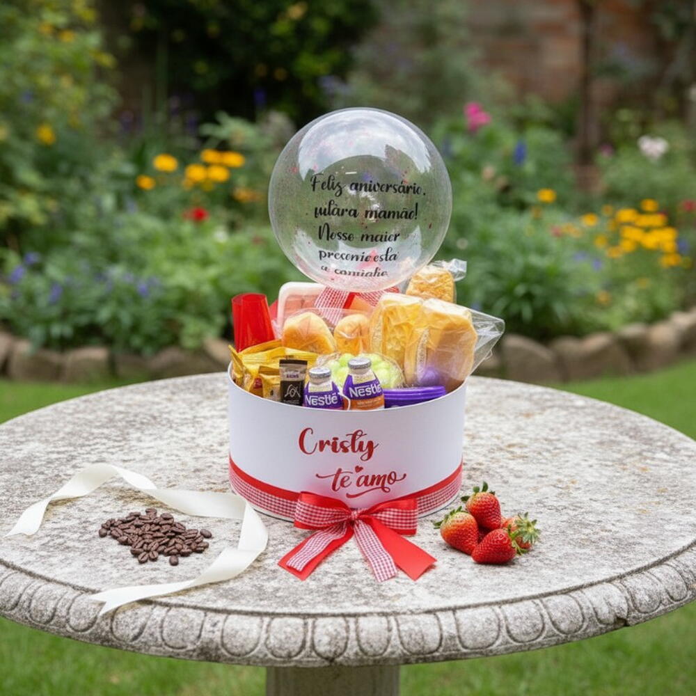 Celebre momentos especiais com a nossa Cesta de Aniversário luxuosamente arranjada! Ela vem repleta de delícias para uma comemoração inesquecível, como requeijão, achocolatado, duas tipos de frutas da época e um suco fresco (200ml). Também contém duas porções de torradas Bauducco, um sachê de açúcar, um delicioso Polenguinho e uma seleção de frios com presunto e mussarela. Desfrute também de três tipos de pães, bolachinhas Bauducco e um iogurte nutritivo. Se isso não fosse suficiente, a cesta ainda vem completa com dois sachês de café solúvel para começar ou terminar o dia de forma agradável. Tudo isso acondicionado em uma bela embalagem de madeira para viagem. É a escolha perfeita para fazer alguém se sentir verdadeiramente especial! Referência: BX-1074