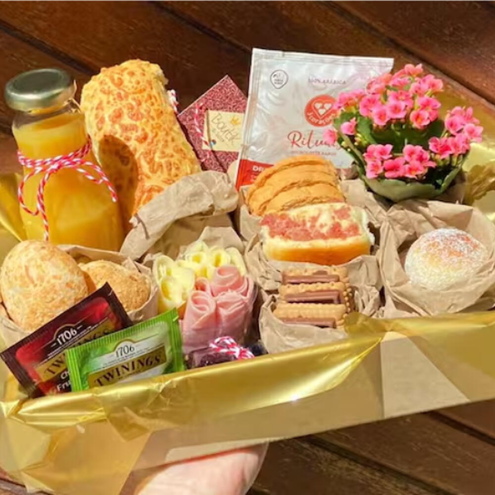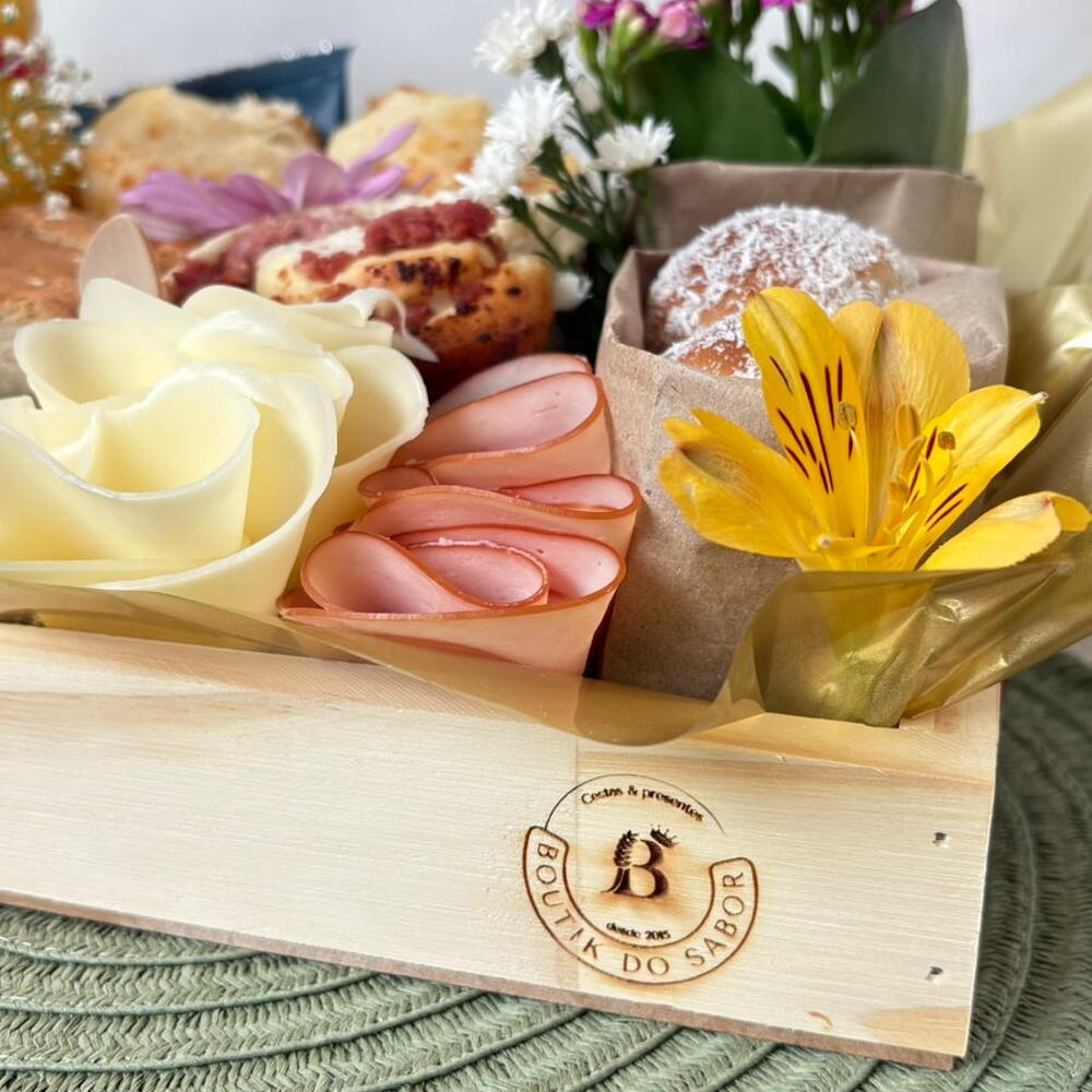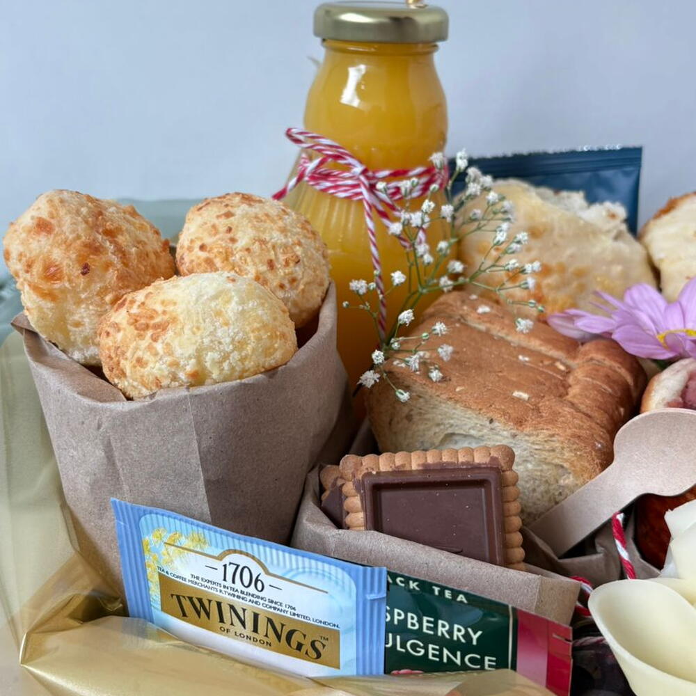 laço - 1 un. drip coffee - 1 un. porção de torradas - 1 un. sachê de chá importado - 2 un. saco celofane transparente - 1 un. bandeja de madeira com alça de couro marrom 20x30cm - 1 un. mini vasinho de flor kalanchoe kalandiva cores variadas - 1 un. pão com queijo parmesão em formato meia lua - 1 un. garrafa de vidro com suco de laranja natural one 300ml - 1 un. canudo de papel - 1 un. porção de mini pão de queijo com queijo parmesão - 1 un. pão de frios fofinho - 1 un. lua de mel recheado com creme patisseriè - 4 un. porção de mussarela enroladinha - 1 un. porção de peito de peru - 1 un. porção de bolachas com barra de chocolate ao leite puro nestlé - 1 un. geléia de frutas vermelhas no potinho de vidro - 1 un.