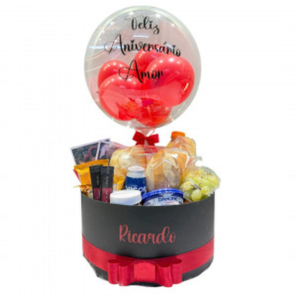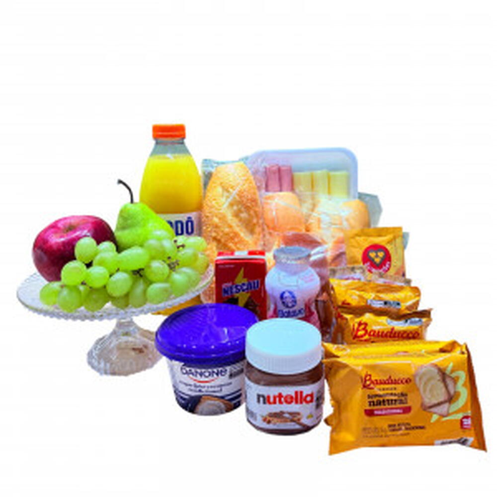 balão personalizado - 1 un. nutella - 1 un. torradas - 2 un. tipos de frutas - 3 un. tipos de pães - 3 un. suco de laranja 900 ml - 1 un. achocolatado 200 ml - 1 un. frios(mussarela e presunto) - 1 un. bolinhos bauducco - 2 un. danone de garrafa - 1 un. sachê de café - 1 un. fotos polaroide - 2 un.