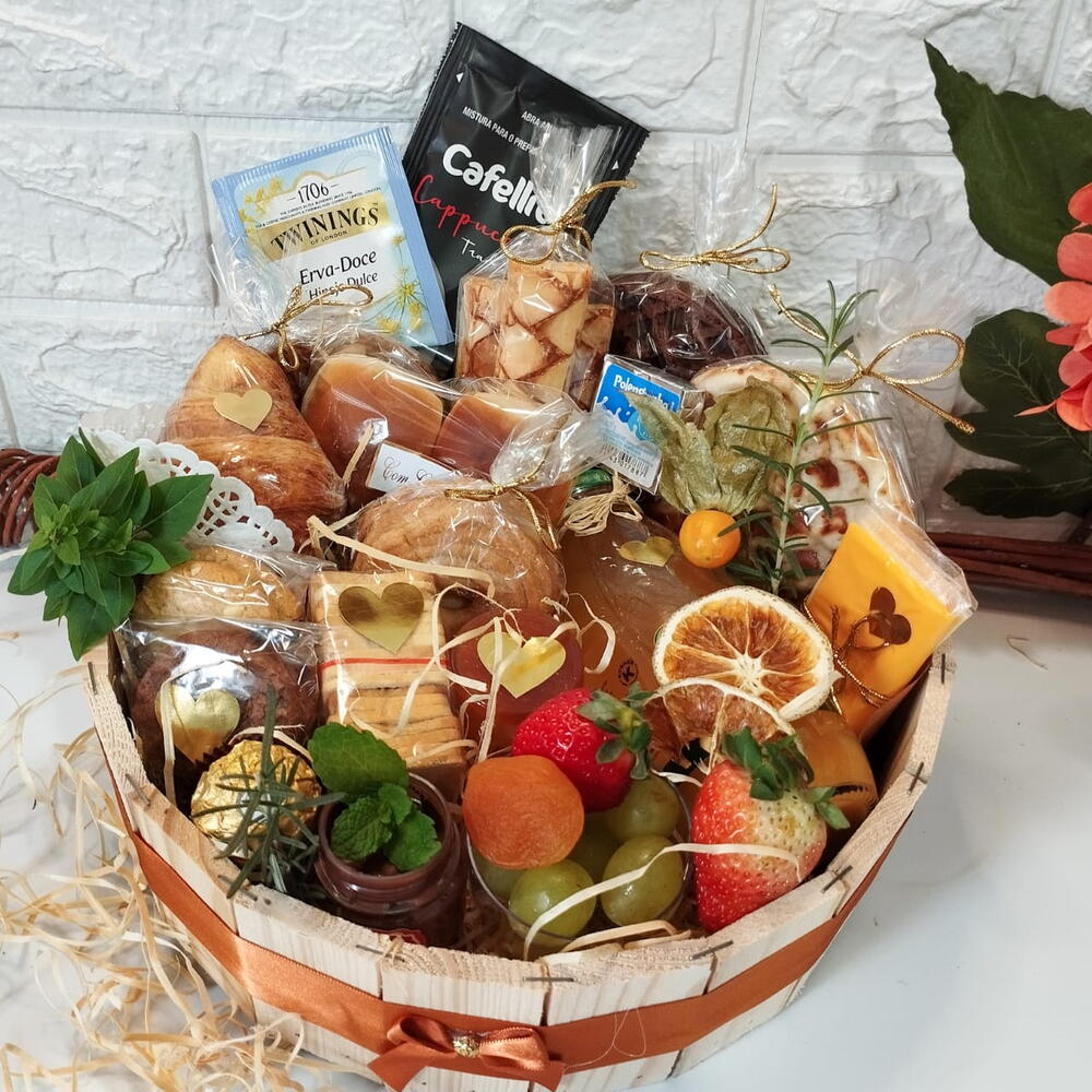 Entre aromas, sabores e delicadezas, um presente que fala sobre amor sem dizer uma palavra. ️Nossa cesta foi pensada para encantar, surpreender e eternizar momentos a dois, com elegância e afeto. Lista de Itens: 1 Suco de uva integral 1 Sachê de café Dripp especial 1 Sachê de cappuccino cremoso 1 Saché de chá orgânico Bolo 1 Queijo Polenguinho 2 Queijo fatias 4 Biscoitos amanteigado importado 2 Waffle caramelizado 1 Saché de torradinhas Geleia St. Dalfour importada 1 Trio de Ferrero Roche Surpreenda com elegância, surpreenda com essência. Aviso Importante A Recafi Cestas preza pela qualidade e excelência em cada detalhe. Informamos que, devido à sazonalidade ou disponibilidade do Dia, reservamo-nos o direito de substituir itens ou marcas de produtos por equivalentes de padrão igual ou superior, sempre mantendo a harmonia e a proposta Original da cesta escolhida. Agradecemos a compreensão e a confiança em nosso trabalho.Presentes ãcontagem