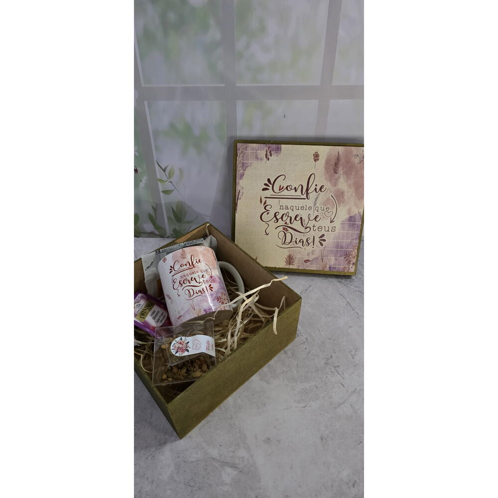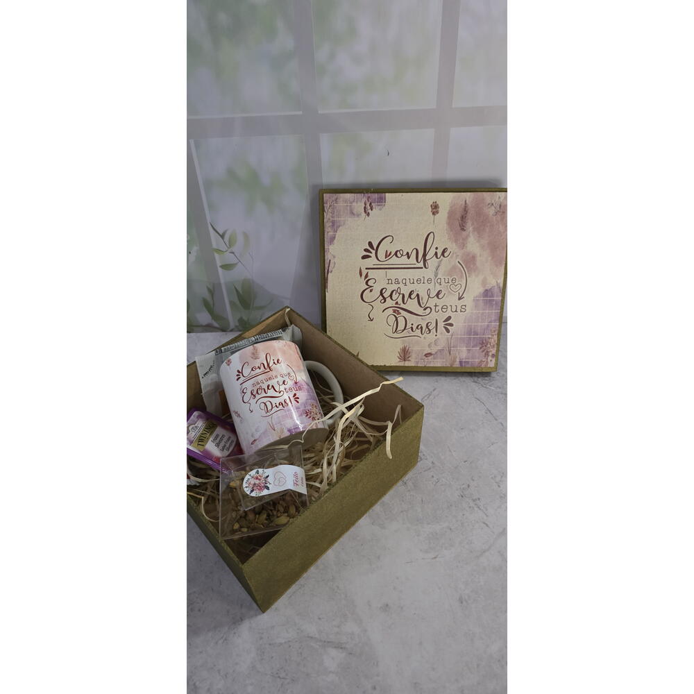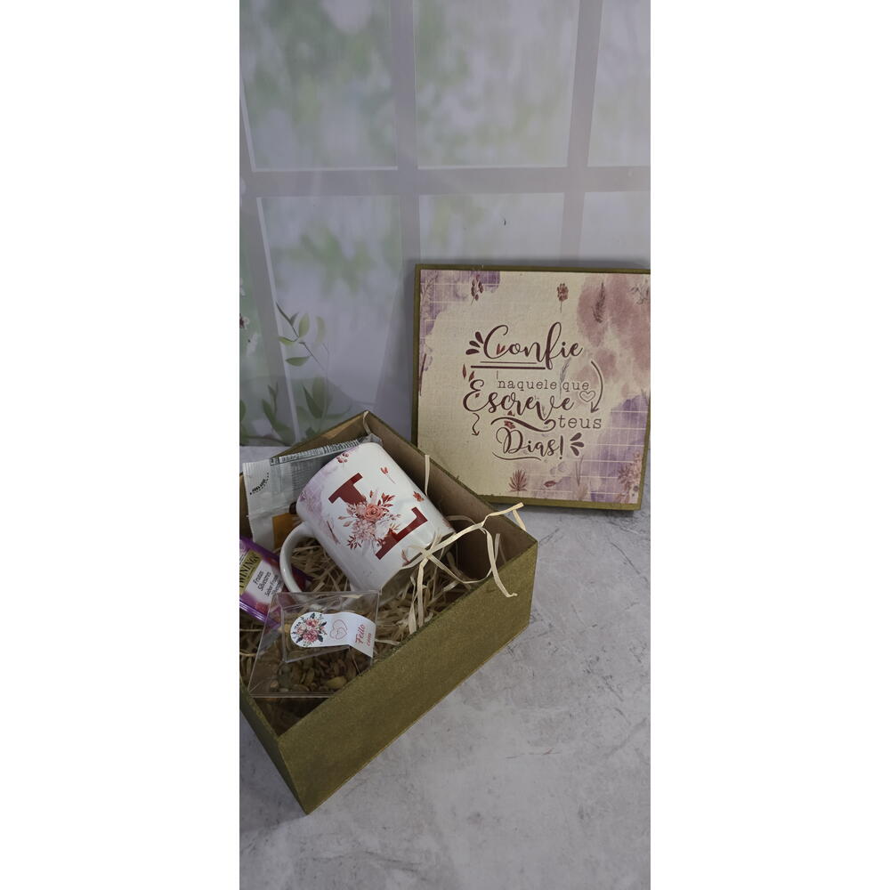 mix de sementes nuts - 1 un. cha - 1 un. caneca de porcelana personalizada - 1 un. drip cofee - 1 un. caixa de mdf com tampa personalizada - 1 un.