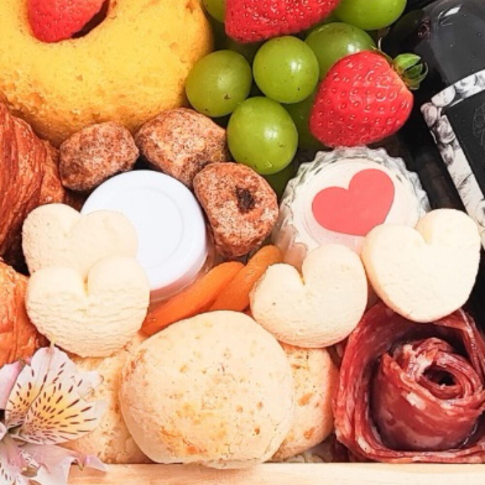 suco de uva - 1 un. iogurte - 1 un. geleia - 1 un. pão de queijo - 3 un. cookie - 1 un. mini bolo - 1 un. morango - 1 un. drip coffee - 1 un. damasco turco - 4 un. lombo - 1 un. bolachinha - 1 un. polenguinho; - 1 un. frescas - 1 un. salame 30g - 1 un. croissant folhado de manteiga - 2 un. uva (cacho) - 1 un. eagles - 1 un.