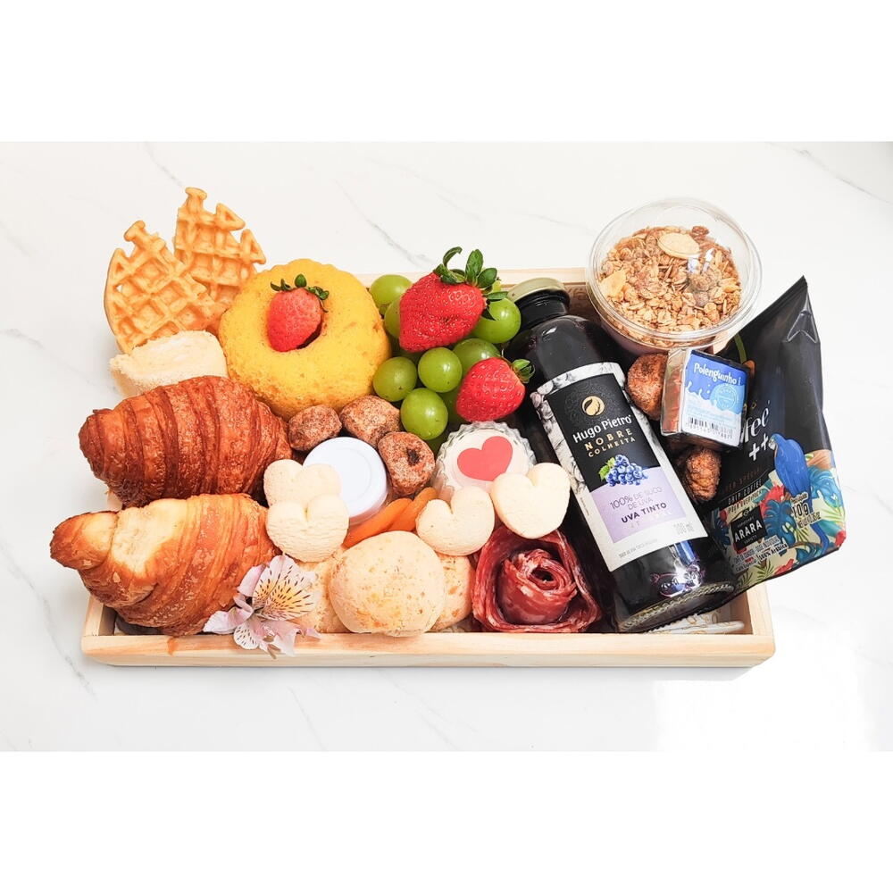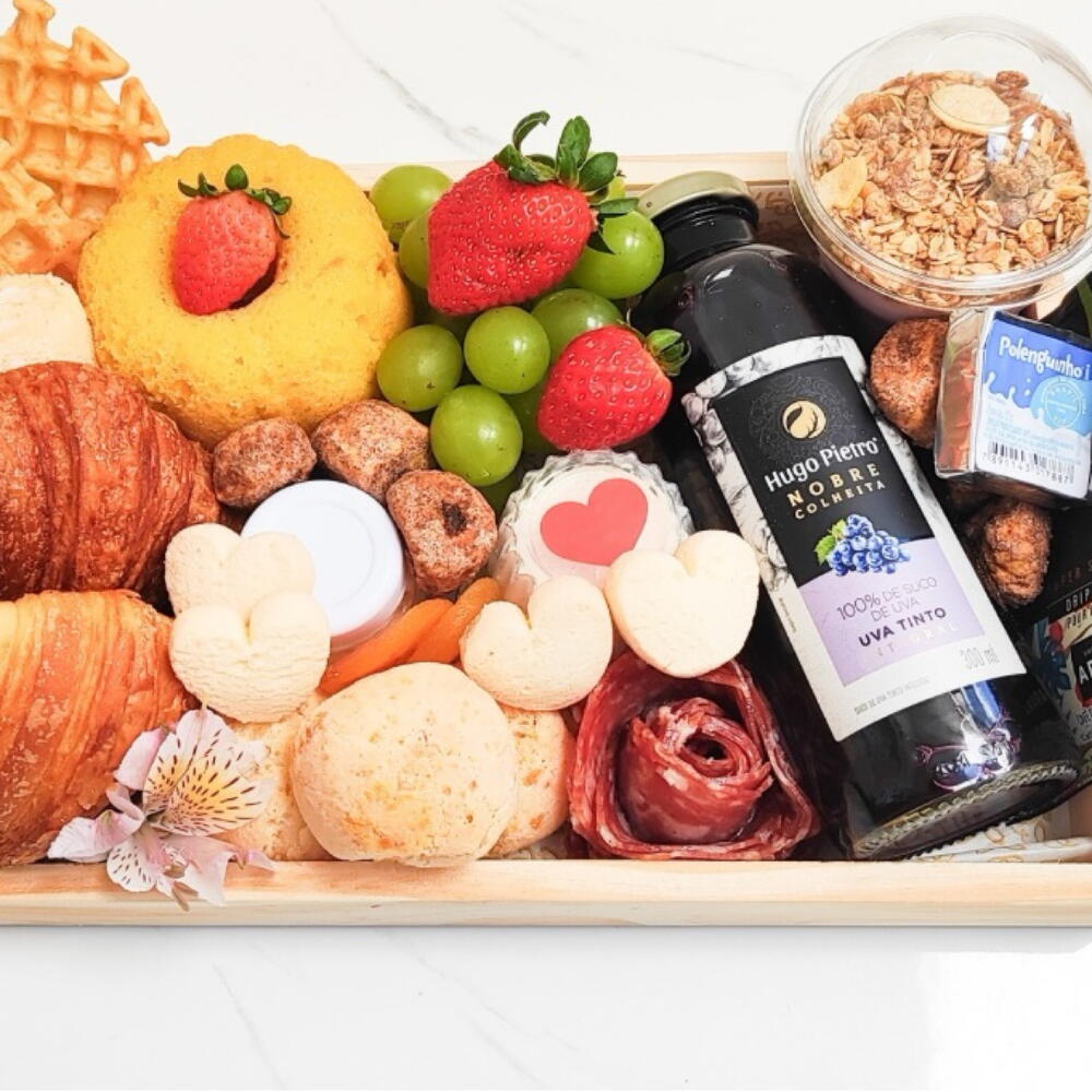 Presentamos Cesta de Café da Manhã, uma seleção perfeita de produtos frescos e saborosos para começar o seu dia. Esta cesta inclui suco de uva, um refrescante iogurte, deliciosa geleia, três unidades de saboroso pão de queijo, um cookie saboroso, um encantador mini bolo, um morango suculento, um drip coffee doce, quatro damascos turcos suculentos, um suculento lombo, uma bolachinha saborosa, um prático polenguinho, e várias frutas frescas. Completa-se com um salame de 30g, dois croissants folhados de manteiga, e um cacho de uvas refrescantes. Não esquecendo a unidade inclusa de eagles. Uma maneira esplêndida de iniciar seu dia da melhor forma possível.