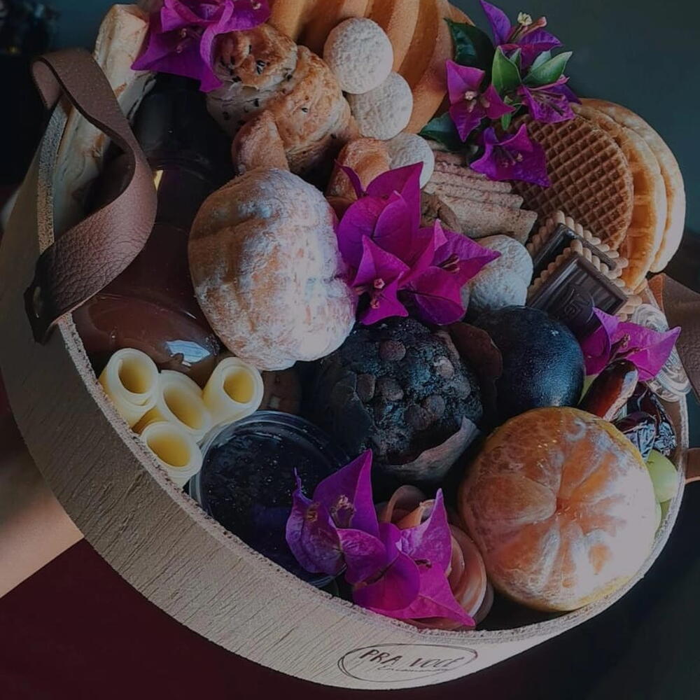 croissant - 1 un. iogurte - 1 un. suco - 500 ml torrada - 6 un. sachê de chá - 1 un. mel - 50 ml waffles - 2 un. uvas - 100 gr. brownie - 1 un. donuts - 1 un. biscoito folhado - 2 un. biscoito decorado - 1 un. presunto fatiado - 75 gr. madeleine - 1 un. bisnaguinha - 2 un. biscoito com cobertura de chocolate - 2 un. mini geleia artesanal - 50 ml drip coffee (café individual) - 1 un. queijo fatiado - 75 gr. biscoito de baunilha - 2 un. biscoito de leite com recheio - 2 un. mini bolo ( consultar sabores) - 1 un. pão recheado ( consultar sabores) - 1 un. biscoito holandês - 1 un. biscoito recheado com creme de avelã - 1 un.