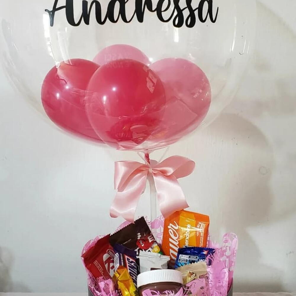 box - 1 un. barra de chocolate - 1 un. kit kat - 1 un. bombons - 2 un. snickers - 1 un. nutella 140g - 1 un. bis xtra - 1 un. mms - 1 un. balão bublle (enviar personalização no pedido) - 1 un.