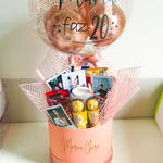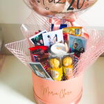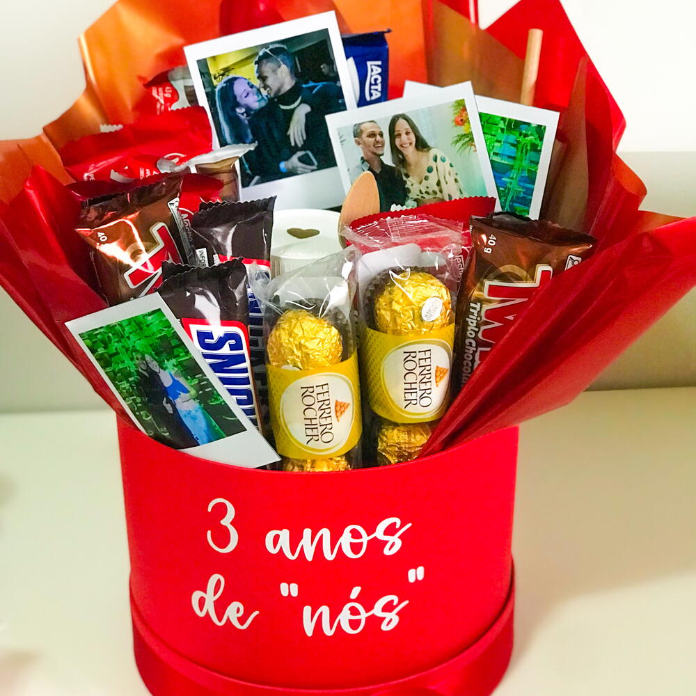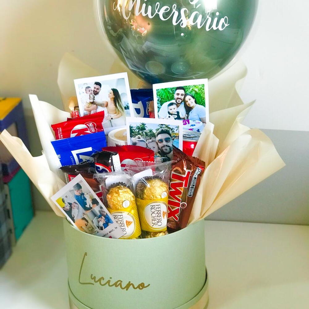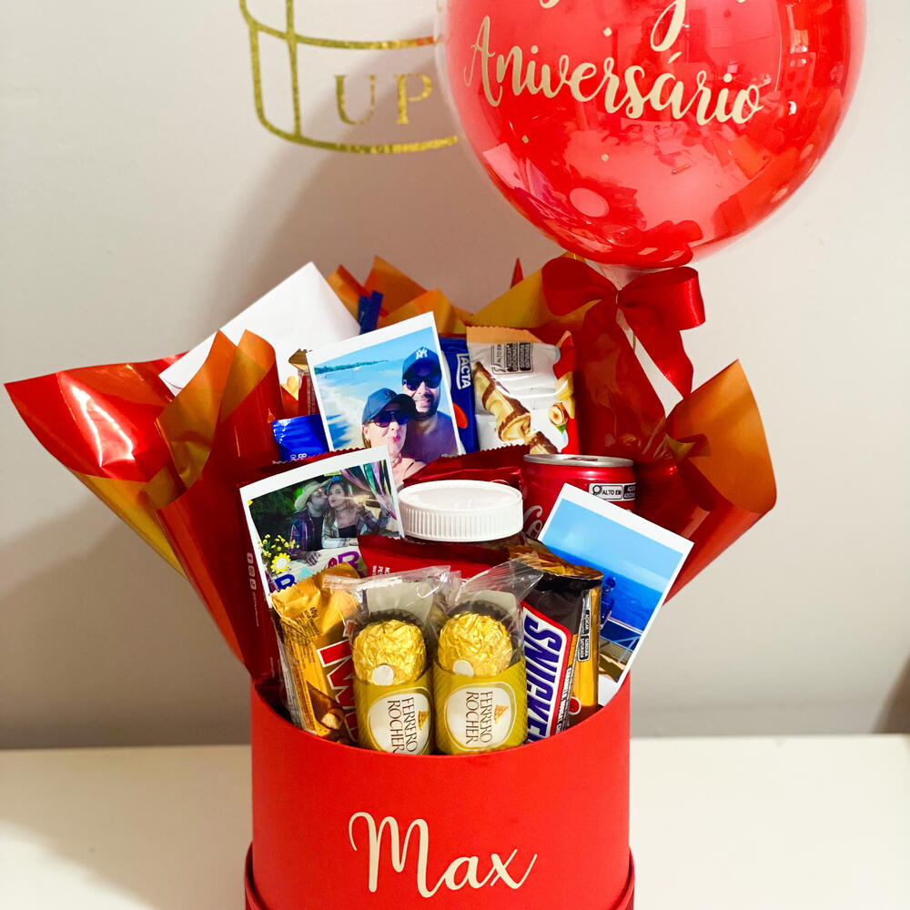 embalagem - 1 un. nutella - 1 un. kit kat - 3 un. ferrero rocher - 3 un. kinder bueno - 2 un. snickers - 2 un. twix - 2 un. coca cola - 1 un. barra de chocolate 80g - 1 un. cx bis - 1 un. balão 25cm frase a escolher - 1 un.