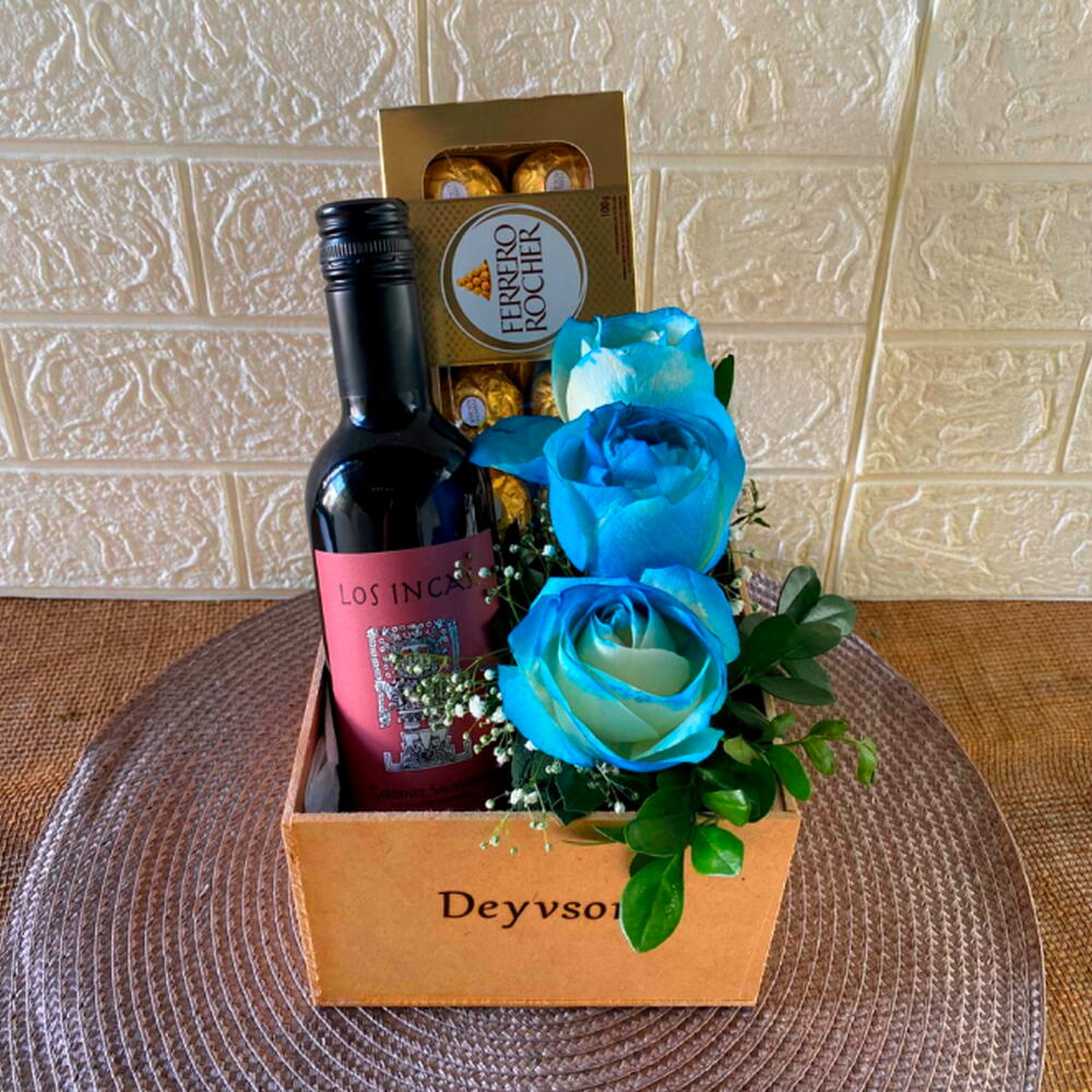 rosa azuis - 3 un. o vinho chileno ou argentino de 375 ml - 1 un. caixa de 8 chocolates ferrero rocher - 1 un. caixa mdf com nome a laser - 1 un.