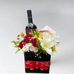 arranjo de flores naturais - 1 un. barra de chocolate 70% cacau - 1 un. vinho tinto seco reserva - 1 un. caixa box preta - 1 un.