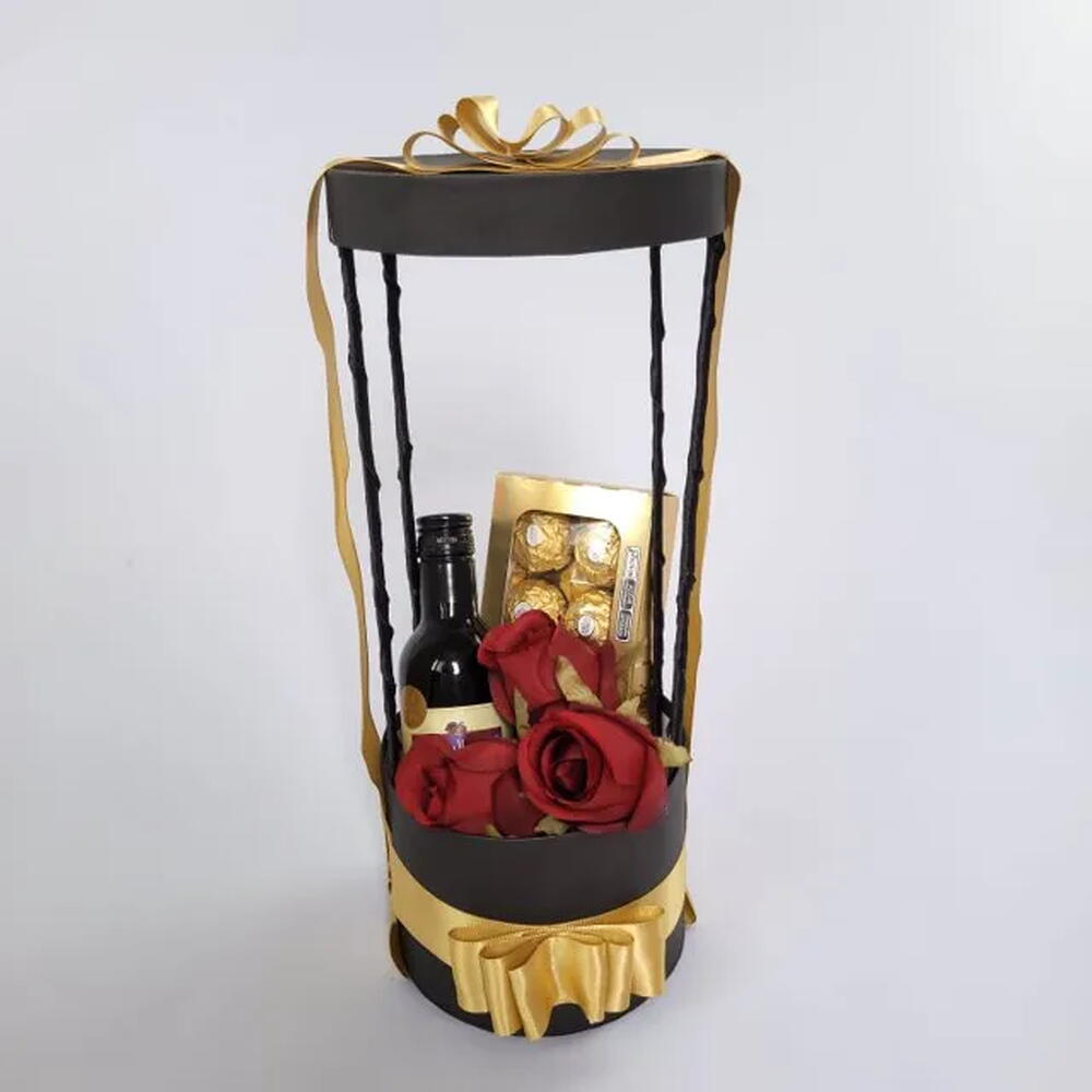 ferrero rocher - 1 un. arranjo de flores - 1 un. mini vinho - 1 un. caixa tematica - 1 un.