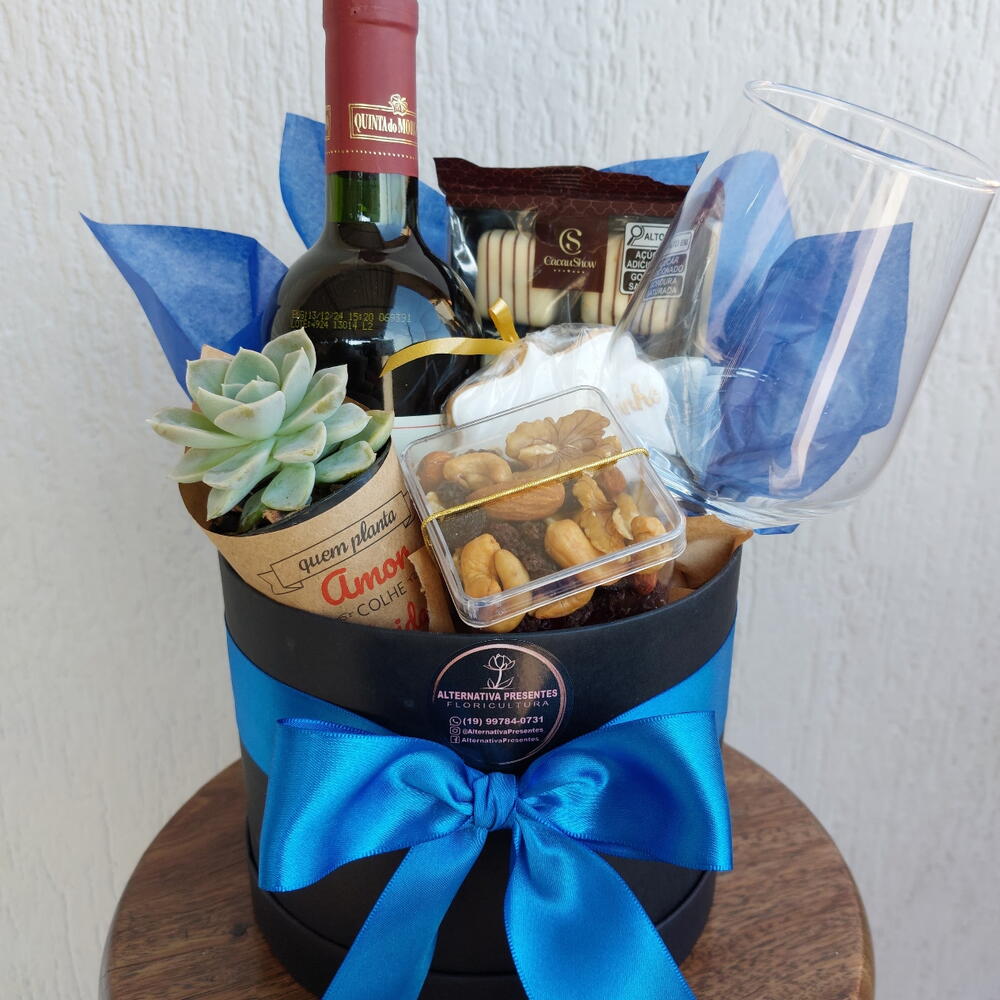 taça de vidro - 1 un. laço - 1 un. nozes - 1 un. saco celofane e laço para embrulho. - 1 un. box cartonada com laço de cetim - 1 un. vinho quinta do morgado - 1 un. biscoito artesanal - 1 un. chocolate pitit deli cacau show - 1 un. suculenta (planta natural) - 1 un.