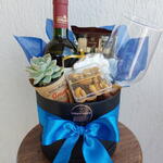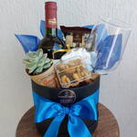 Cesta box com vinho e petiscos azul