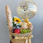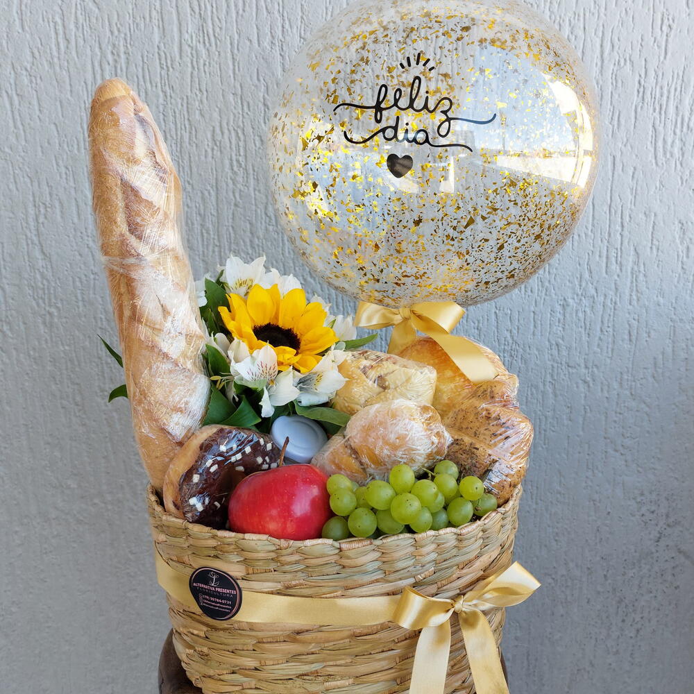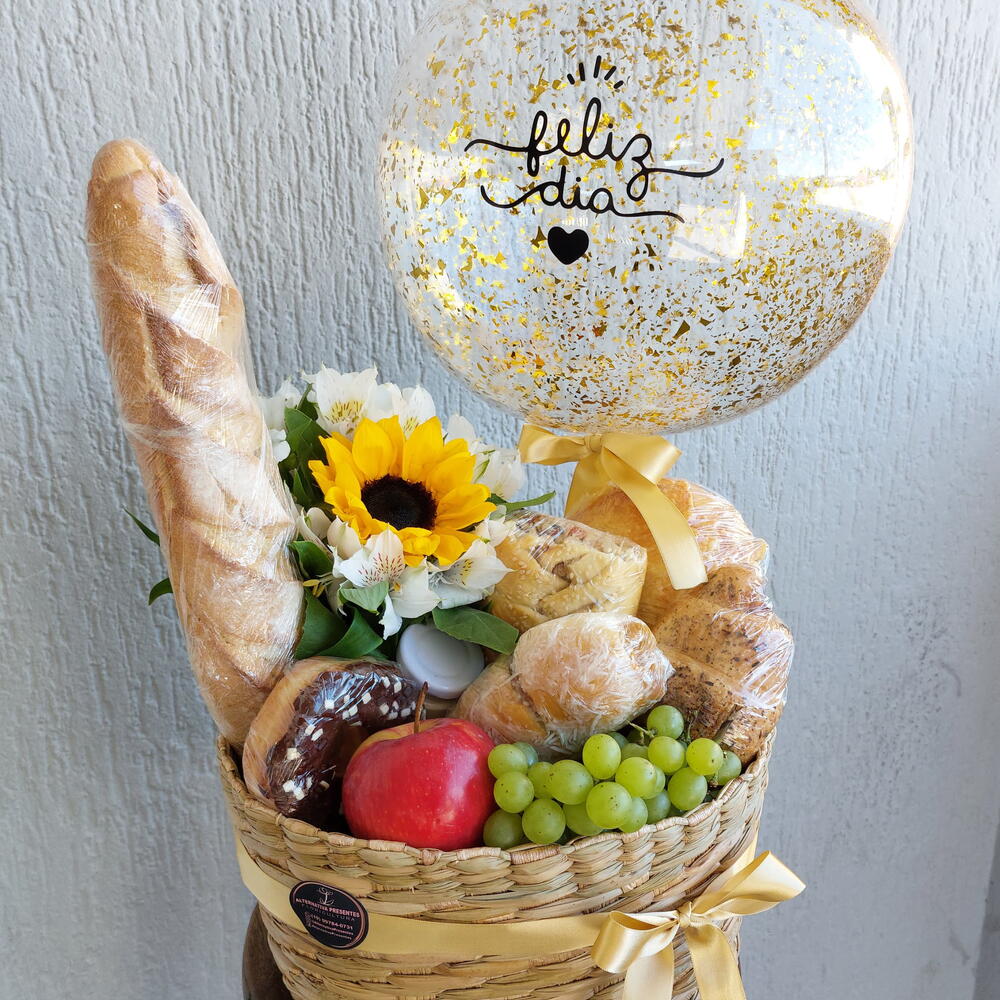 Balão Bubble Cesta palha Uvas Maçã 2 Panificação salgada 1 Panificação doce Pão crostado de queijo Iorque Grego Potinho de creme de ricota Baguete Enchimento Decoração cesta Laço e saco embrulho Girassol, astromelias Donuts Bebida láctea starbucks