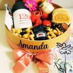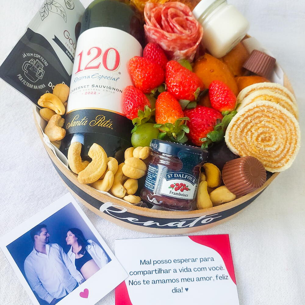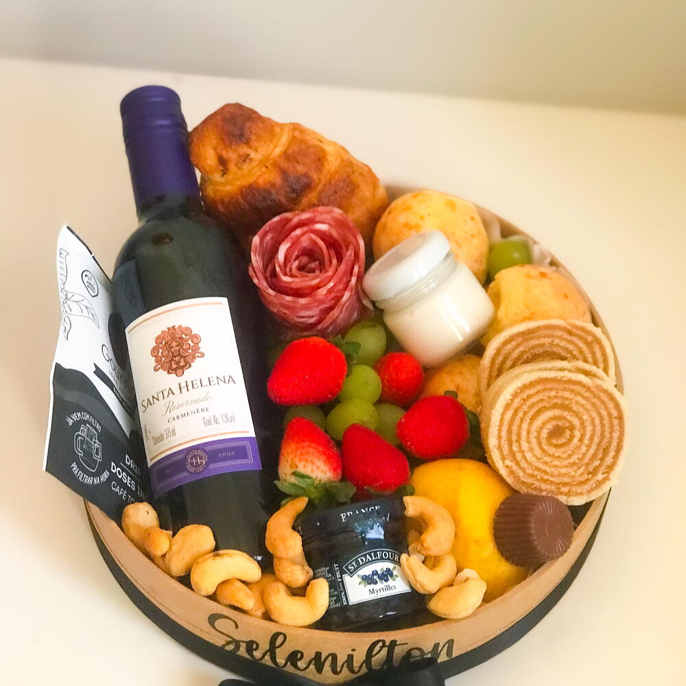 chocolate - 1 un. croissant recheado - 1 un. castanha caju 100 gr - 1 un. coffe drip - 1 un. mini geleia dalfour - 1 un. vinho fino 375ml - 1 un. bolo rolo artesanal doce de leite - 3 un. pães de batata artesanal - 3 un. pote requeijão - 1 un. flor de salame ou lombo canadense - 1 un. 3 tipo de de frutas ( uva semente - 1 un. ameixa e morango ) - 1 un.