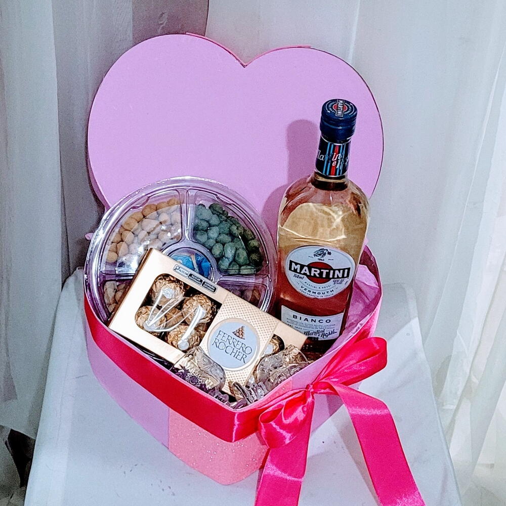 laço de cetim - 2 un. ferrero rocher 8 un unidades - 1 un. martini bianco 700ml - 1 un. petiskeira de amendoins salgado - 1 un. caixa coração simples 29x25 - 1 un. taça cristal ecológico shot - 2 un. sacola presente incolor - 1 un.