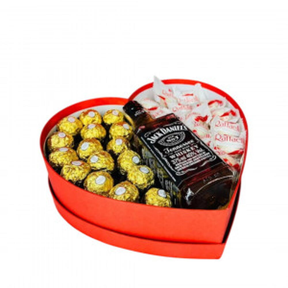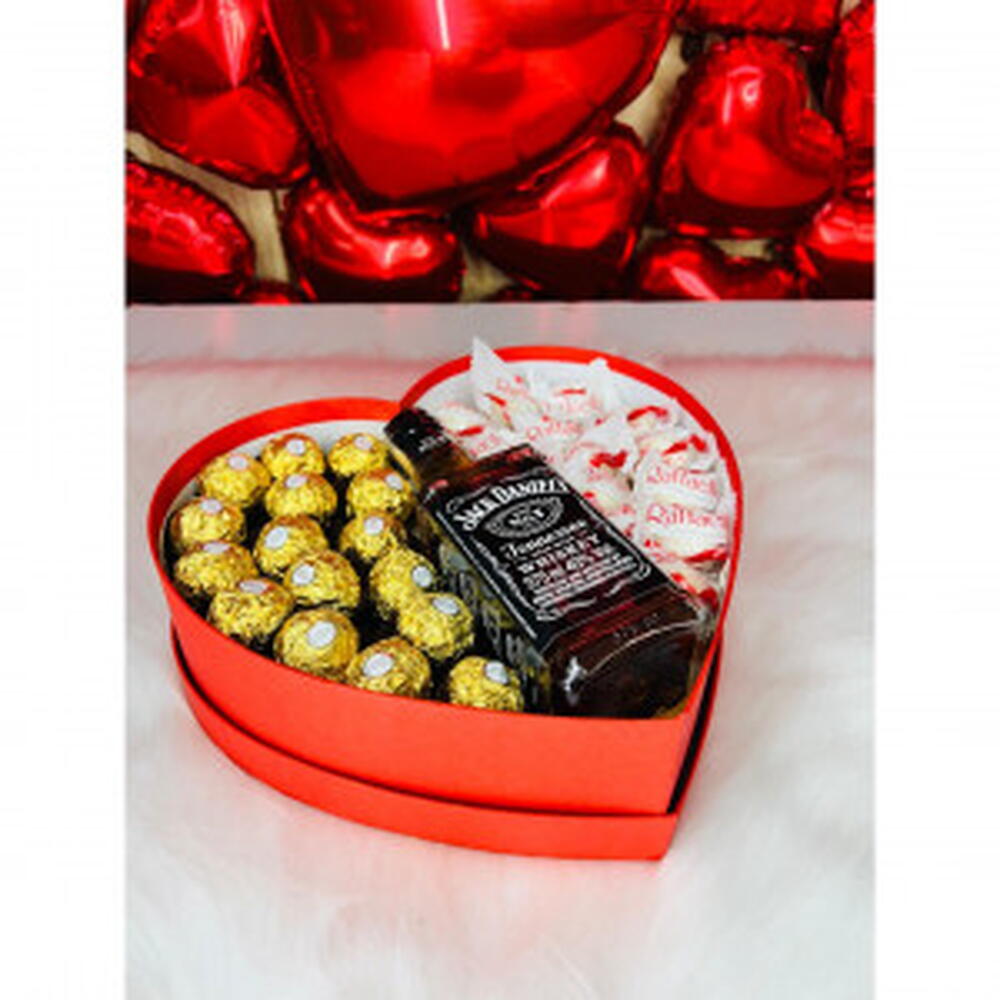 bombons ferrero rocher - 16 un. bombons raffaello - 16 un. whisky 375ml - 1 un. coração cartonado para viagem - 1 un.