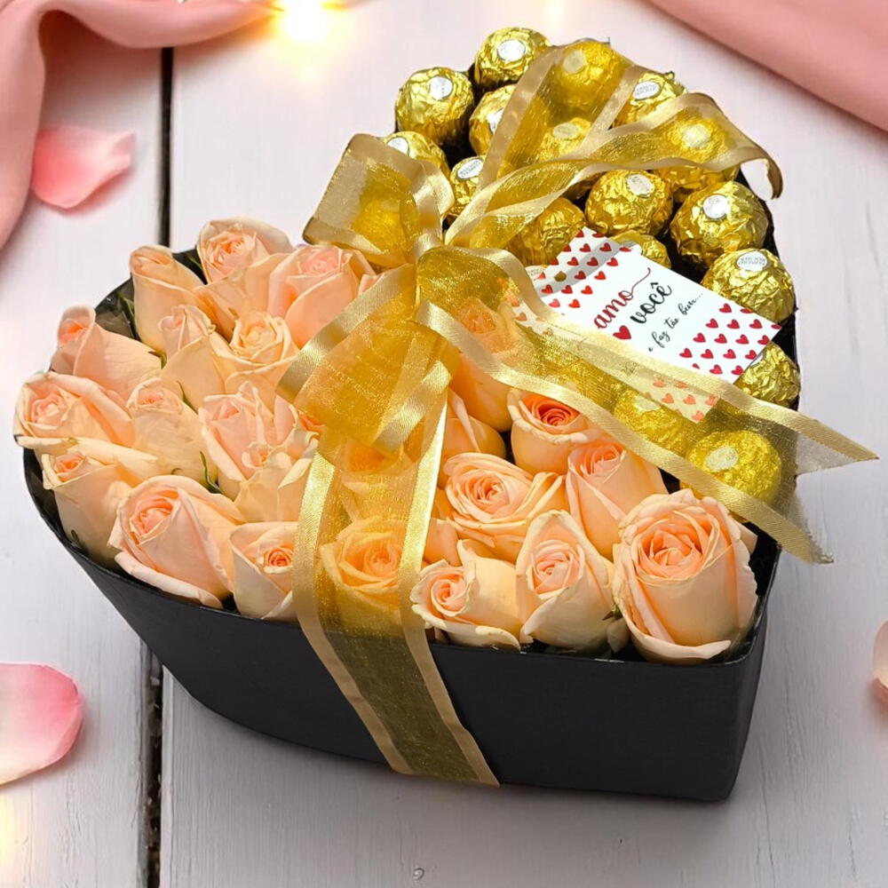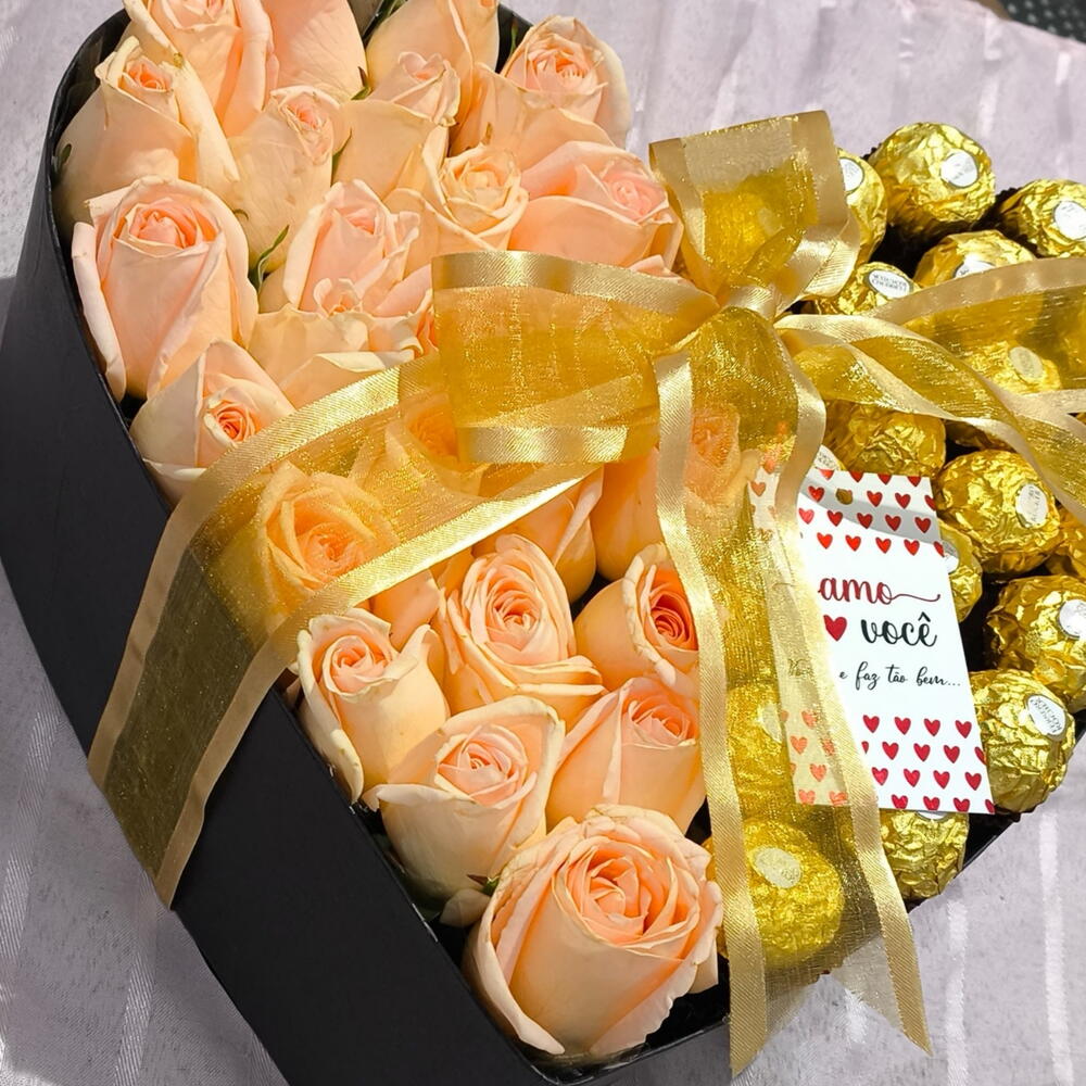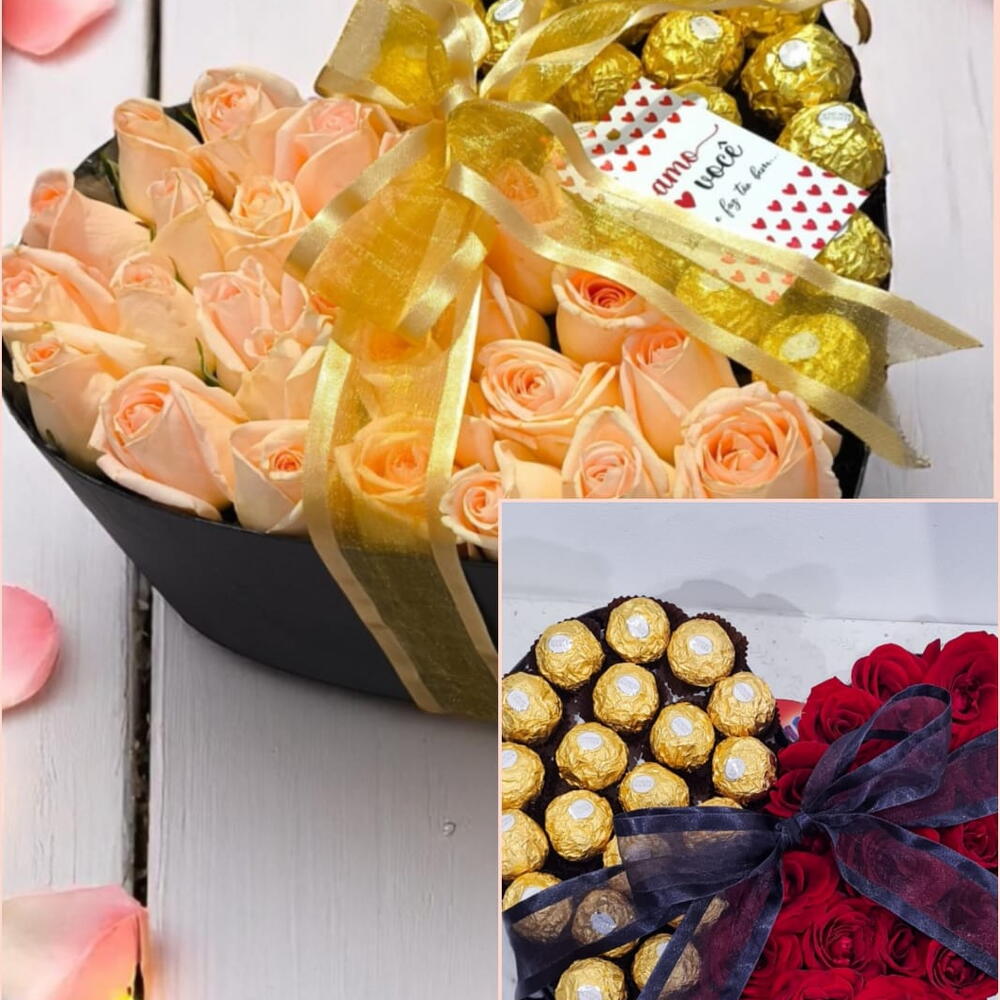 ferrero rocher - 20 un. rosa vermelhas - 20 un. caixa cartonada formato coração - 1 un. personalização na caixa - 1 un. laço em fita decorativa - 1 un.