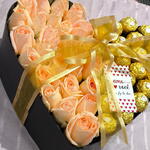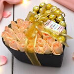 Este kit de presente é a maneira perfeita de expressar seu amor e apreço para uma pessoa especial. Com suas 20 belas rosas vermelhas, saboreie o romantismo puro que elas transmitem. Os 20 irresistíveis Ferrero Rocher adicionam um toque de doçura que certamente irá encantar. O kit é apresentado em uma elegante caixa cartonada em formato de coração, adornada com um laço em fita decorativa, adicionando um toque final perfeito a este presente. Além disso, a caixa pode ser personalizada, tornando-o um presente verdadeiramente exclusivo e memorável.