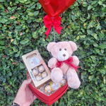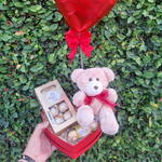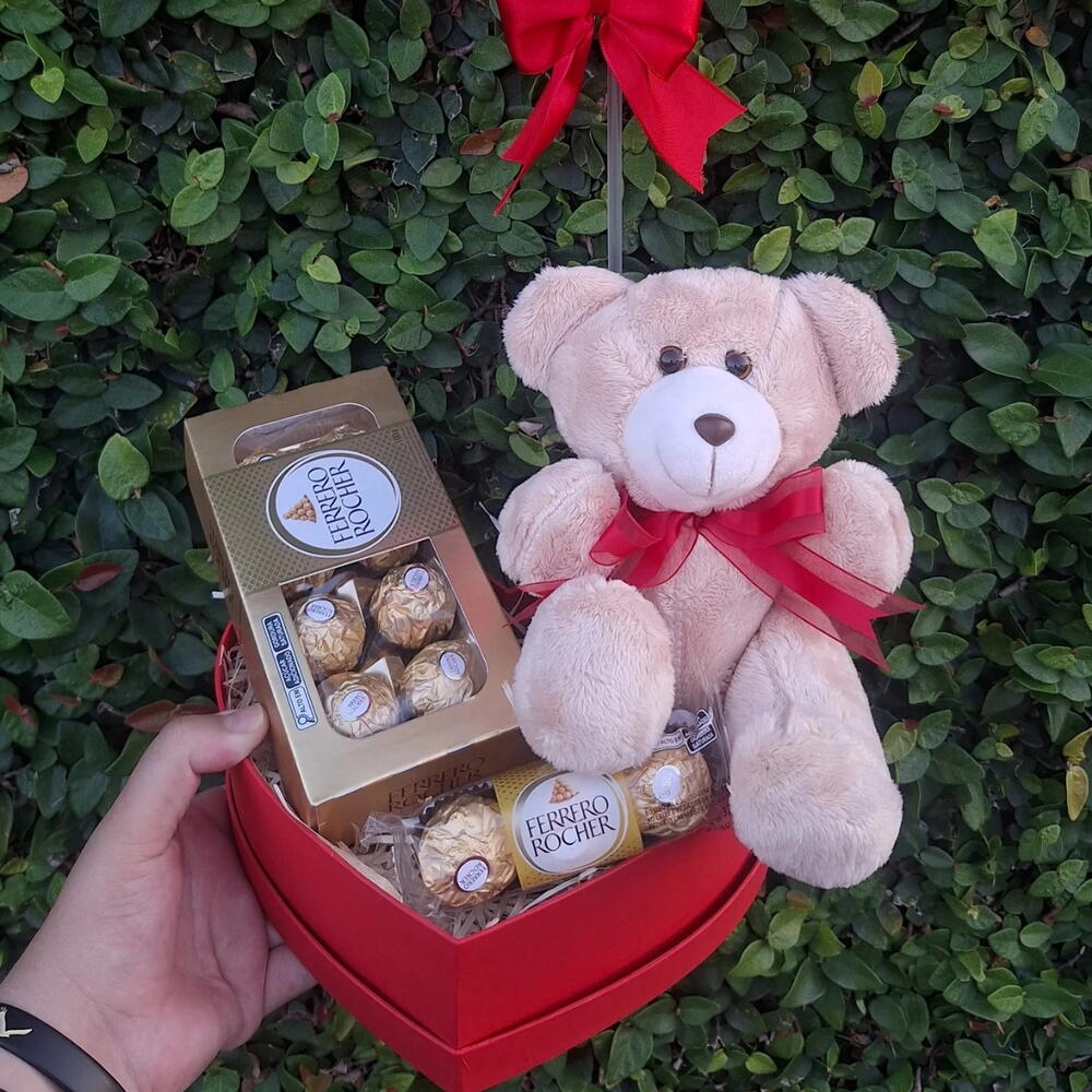 ferrero rocher - 8 un. box cartonada - 1 un. balão metalizado coração - 1 un. pelúcia ursa articulada - 1 un. frase adesiva dia da mulher - 1 un.