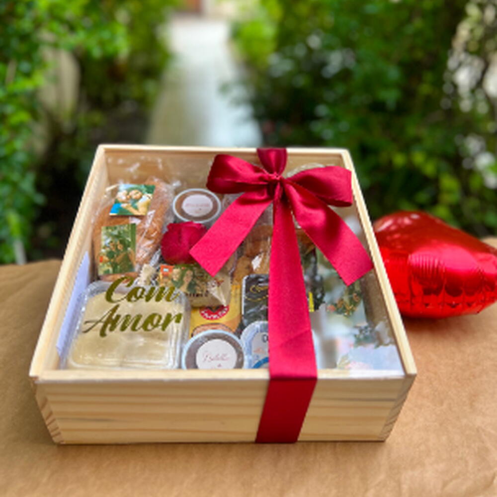 croissant - 1 un. biscoito amanteigado - 1 un. goiabinha - 1 un. chocolates - 2 un. pão de mel - 1 un. cookies - 1 un. torrada - 1 un. achocolatado - 1 un. fotos - 6 un. balão de coração - 1 un. frutas da estação - 2 un. capuccinos - 2 un. bolo de rolo - 1 un. danete - 1 un. bolacha - 1 un. bolo no pote - 1 un. pão delícia - 1 un. stroopwafel holandês - 1 un. logurte - 1 un. bisnaga de geléia - 1 un. nescal cereal - 1 un. bisnaga de doce de leite - 1 un. bisnaga de requeijão - 1 un. sucos integrais - 2 un. logurte grego - 1 un. bolo madeleine francês - 1 un. bisnaga de nutella - 1 un. biscoito sequilho - 1 un. plaquinhas com frases - 1 un.