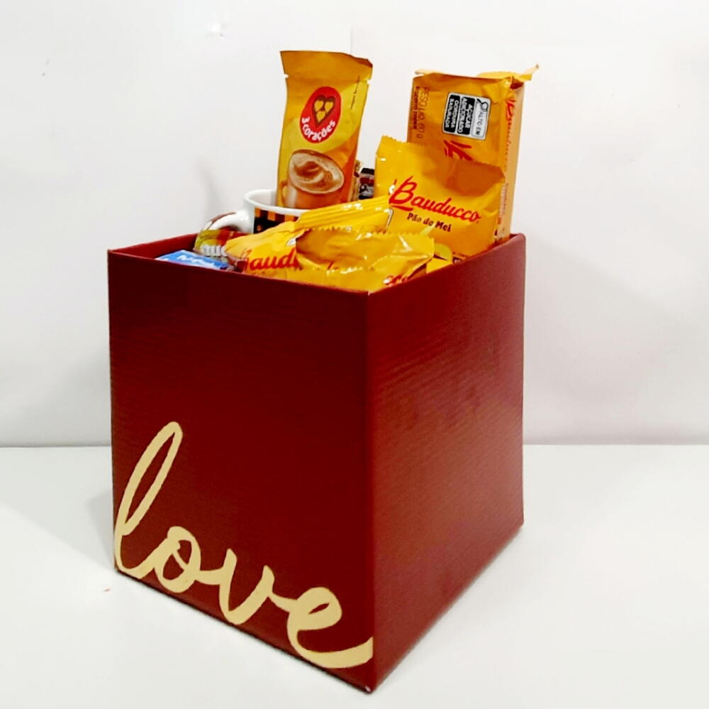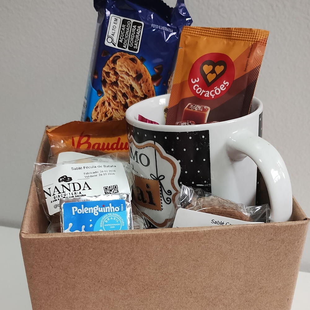 suco - 1 un. torrada - 1 un. biscoito salgado - 1 un. cappuccino - 1 un. polenguinho - 1 un. mini bolo - 1 un. cartão para mensagem - 1 un. sachê de açúcar - 2 un. blister de creme de amendoim - 2 un. sachê de adoçante - 2 un. laço decorativo - 1 un. blister de geléia 10g - 2 un. paçoca - 1 un. palha ou folha de celofane - 1 un. cookies com gostas de chocolate - 1 un. celofane para fechamento - 1 un. amanteigados artesanais - 6 un. box cartonado cores variadas - 1 un.