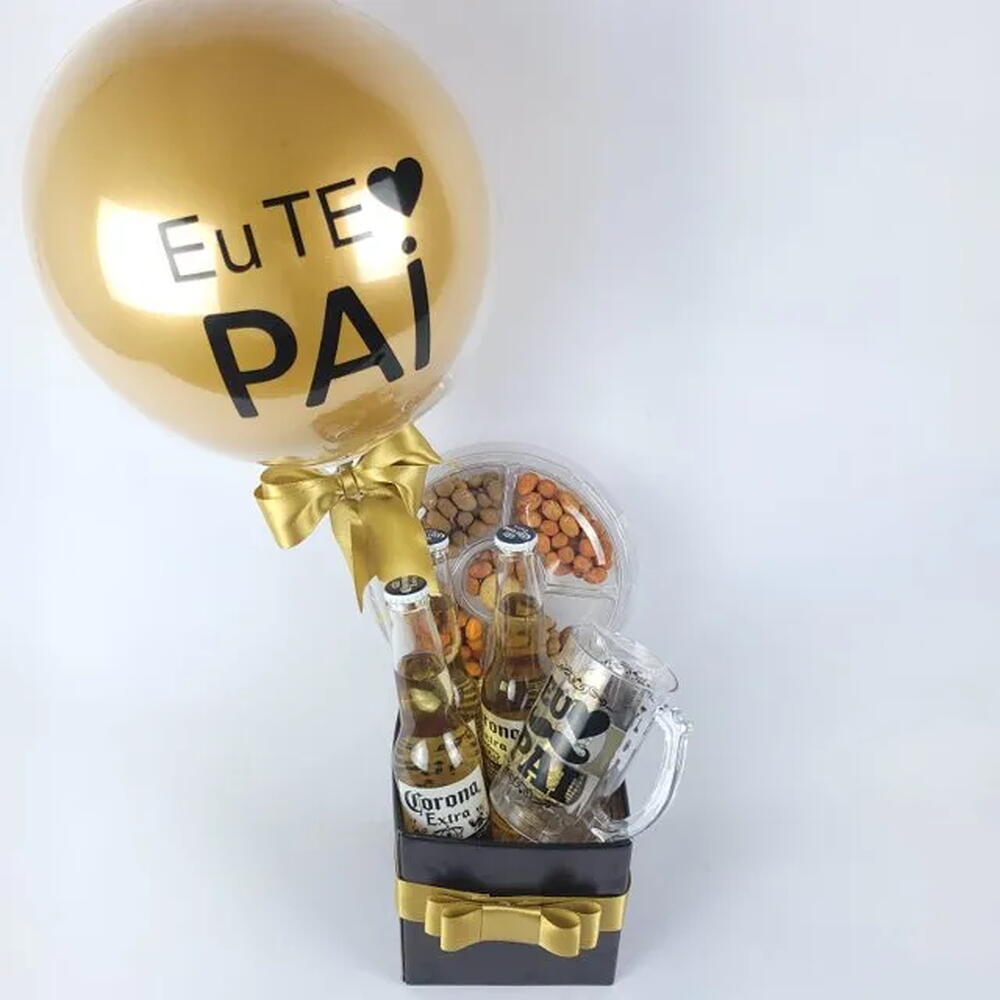 cervejas long neck - 3 un. balão bubble com escrita personalizada de dia dos pais - 1 un. caneca de chopcerveja personalizado temática dia dos pais - 1 un. petisqueira com mix de amendoins e petiscos secos - 1 un. caixa cartotecada personalizada com laço e fita - 1 un.