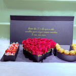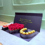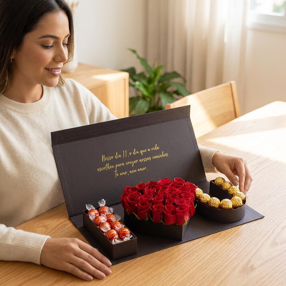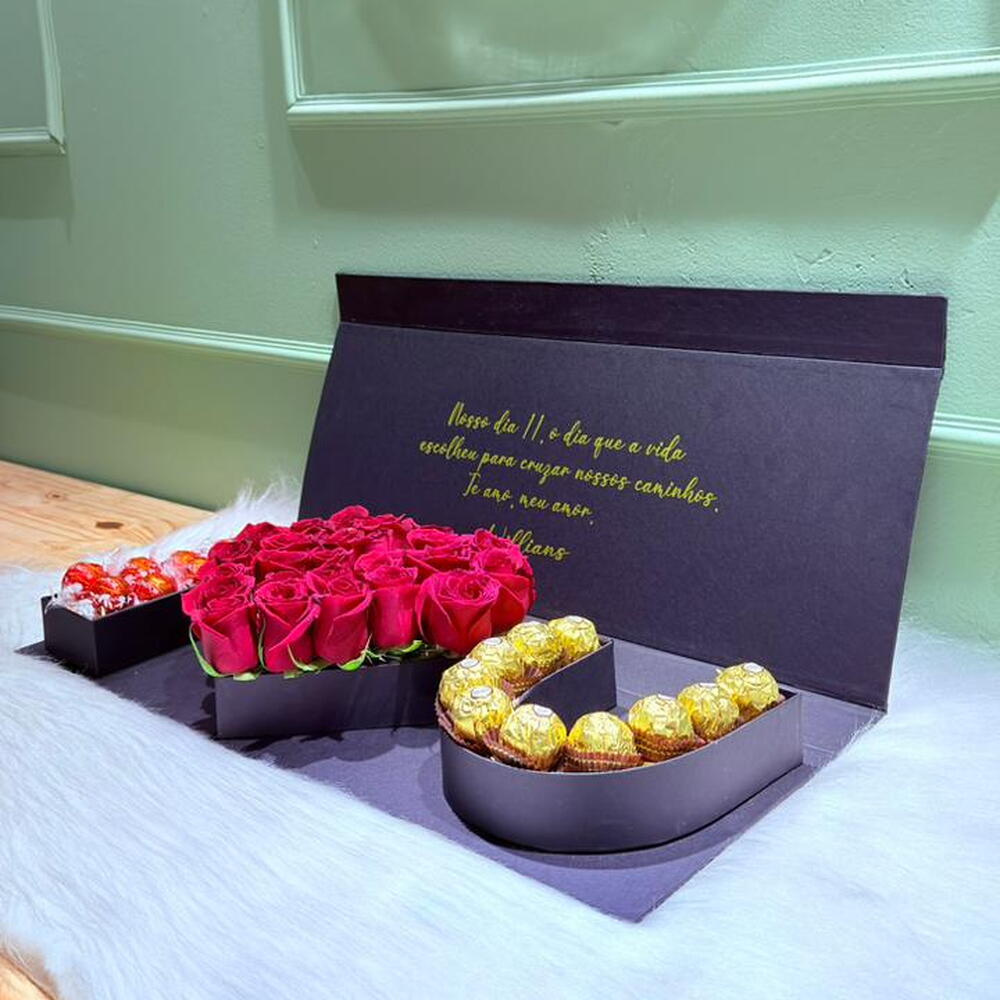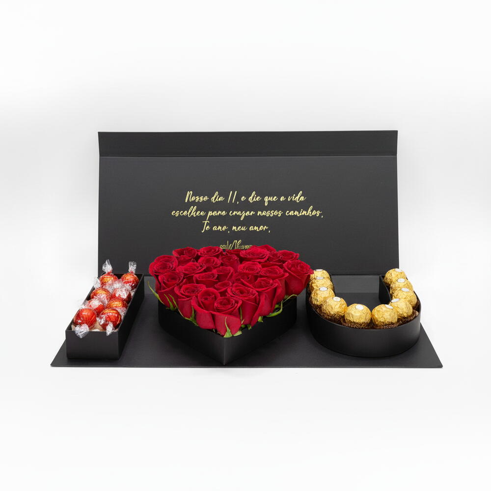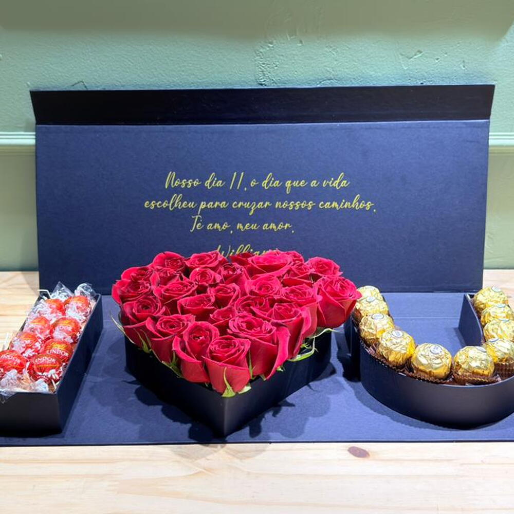 bombom ferrero rocher - 9 un. bombom lindt - 10 un. botões de rosa - 20 un. caixa cartonada para viagem - 1 un.