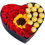 Presenteie alguém especial com este encantador conjunto de Flores e Chocolate. Composto por um vibrante girassol, acompanhado por 15 belíssimas rosas vermelhas (o tom pode variar), este presente é a declaração perfeita de amor e carinho. Adicionamos também 13 deliciosos chocolates Ferrero Rocher, aprimorando a doçura deste presente. Todos esses elementos são delicadamente arranjados em uma charmosa caixa de coração cartonado, envolta em uma embalagem de celofane e finalizada com um laço especial, criando um presente realmente deslumbrante.