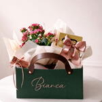 Encante alguém especial com este conjunto exclusivo de Flores e Chocolate. Equipado com Ferrero Rocher (com 8 peças), uma graciosa mini garrafa de espumante Monte Pascoal e uma mala personalizada para dar um toque de elegância e surpresa. Complementando este presente delicadamente selecionado, está a flor Kaloches. A cor da flor será a que estiver disponível no dia, mantendo sempre a frescura e beleza do presente. Este conjunto é perfeito para demonstrar seu carinho e apreciação em qualquer ocasião.