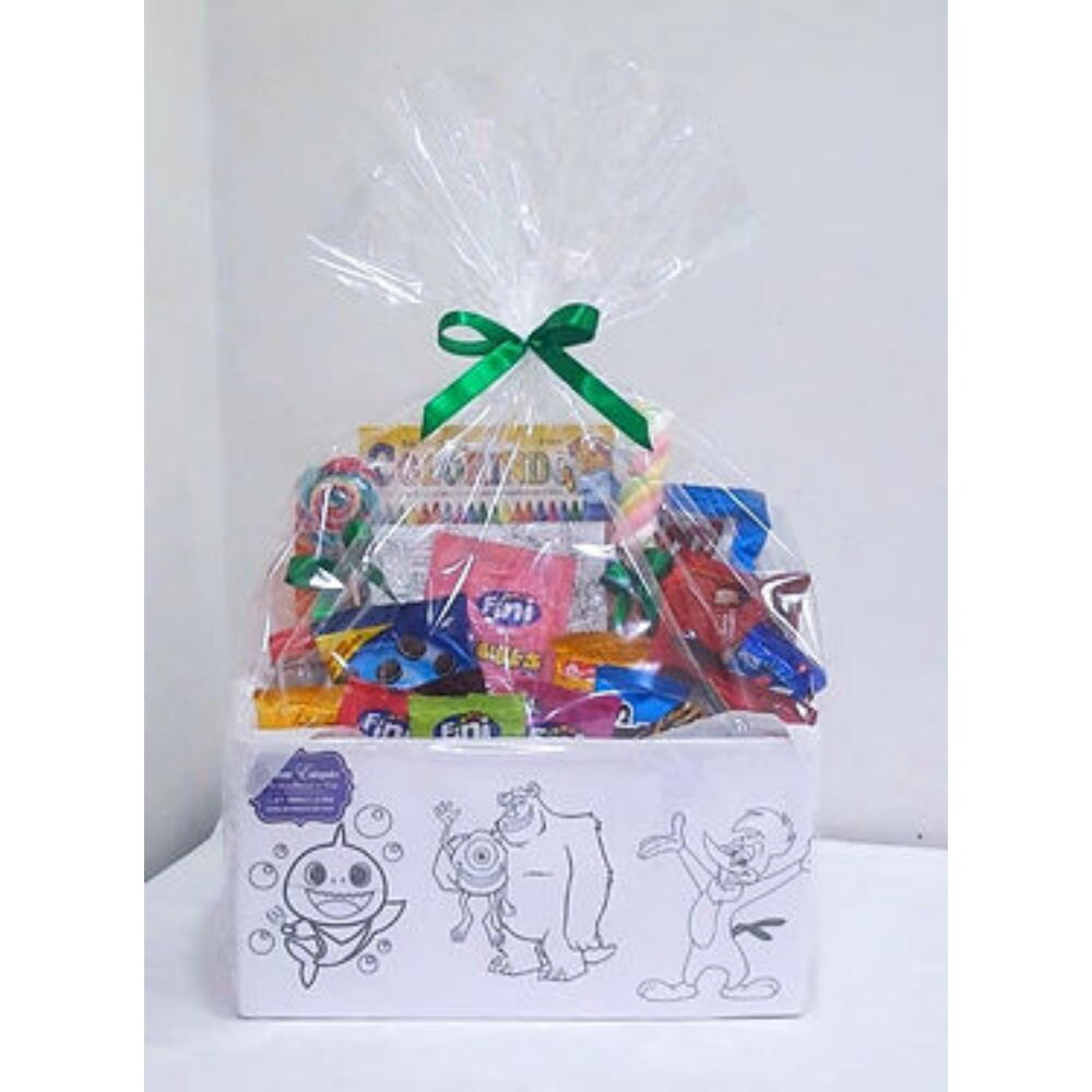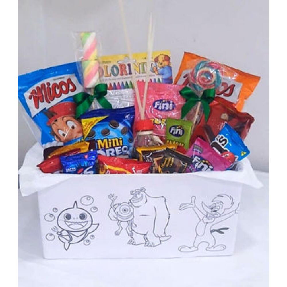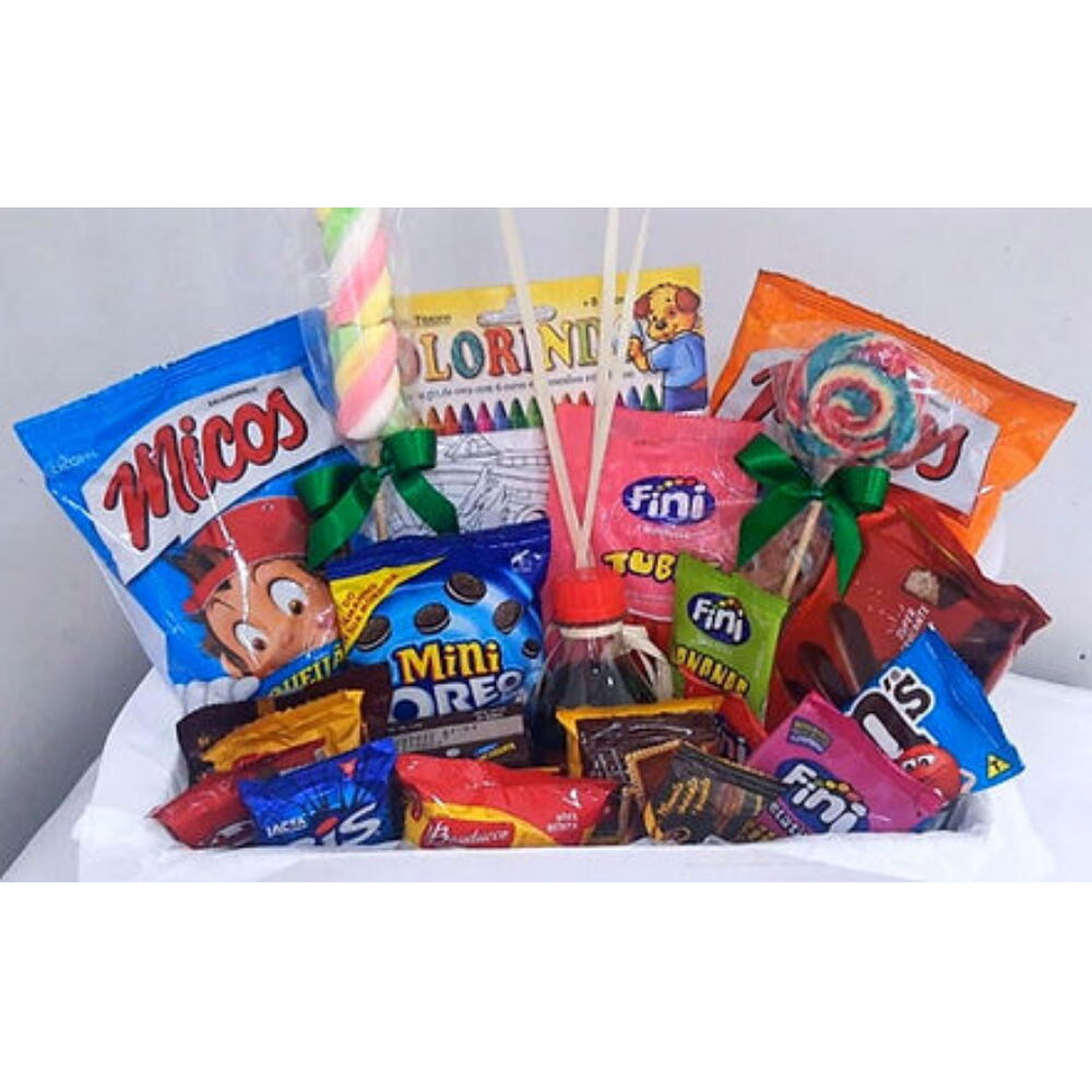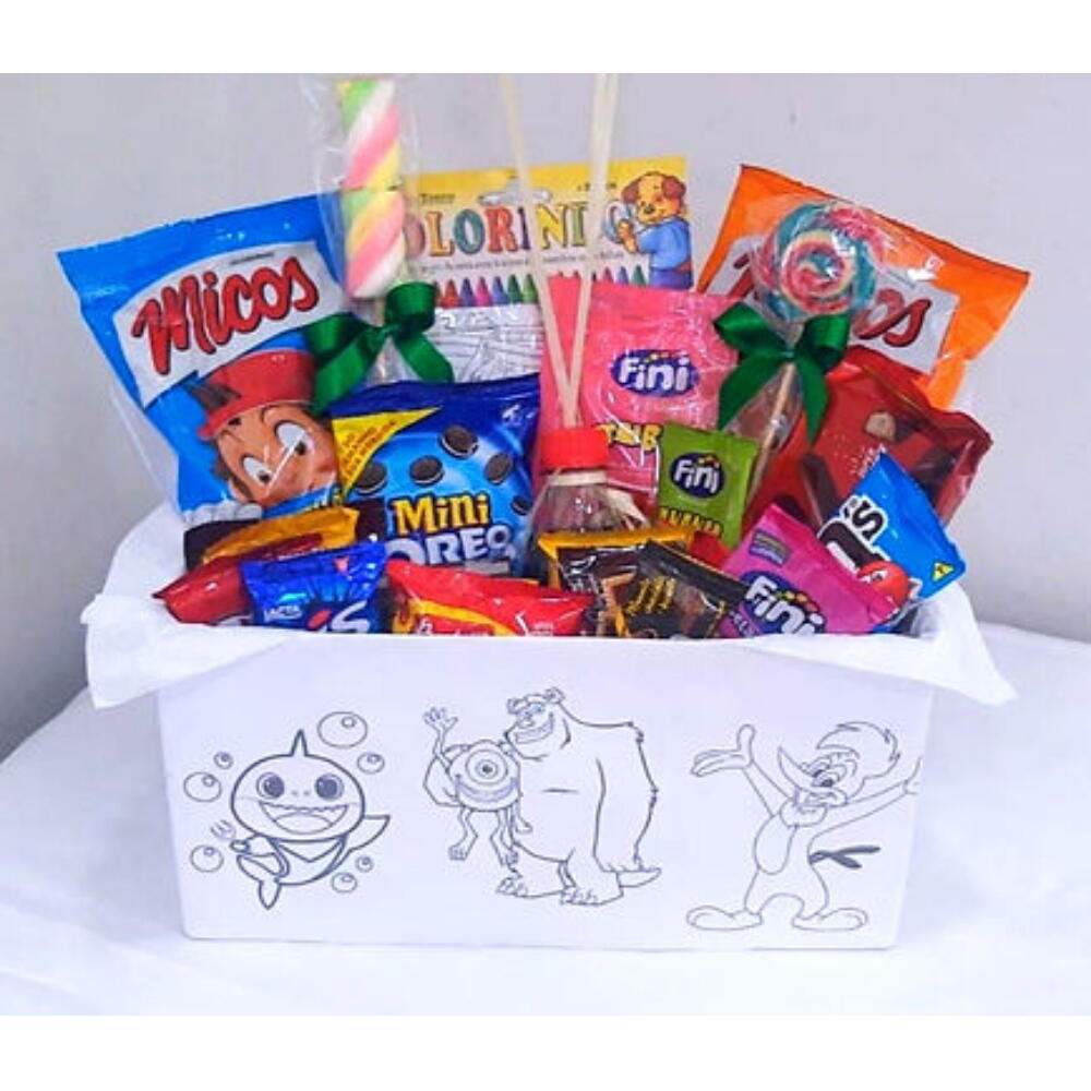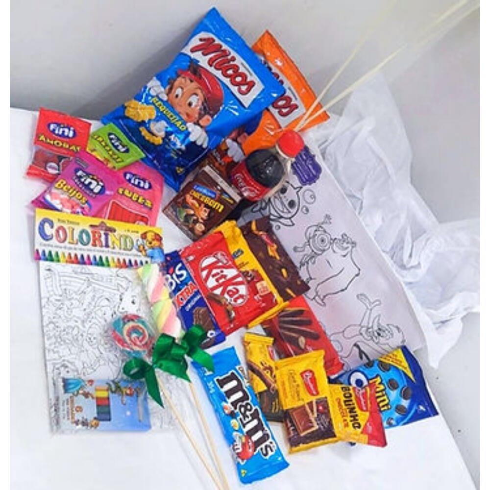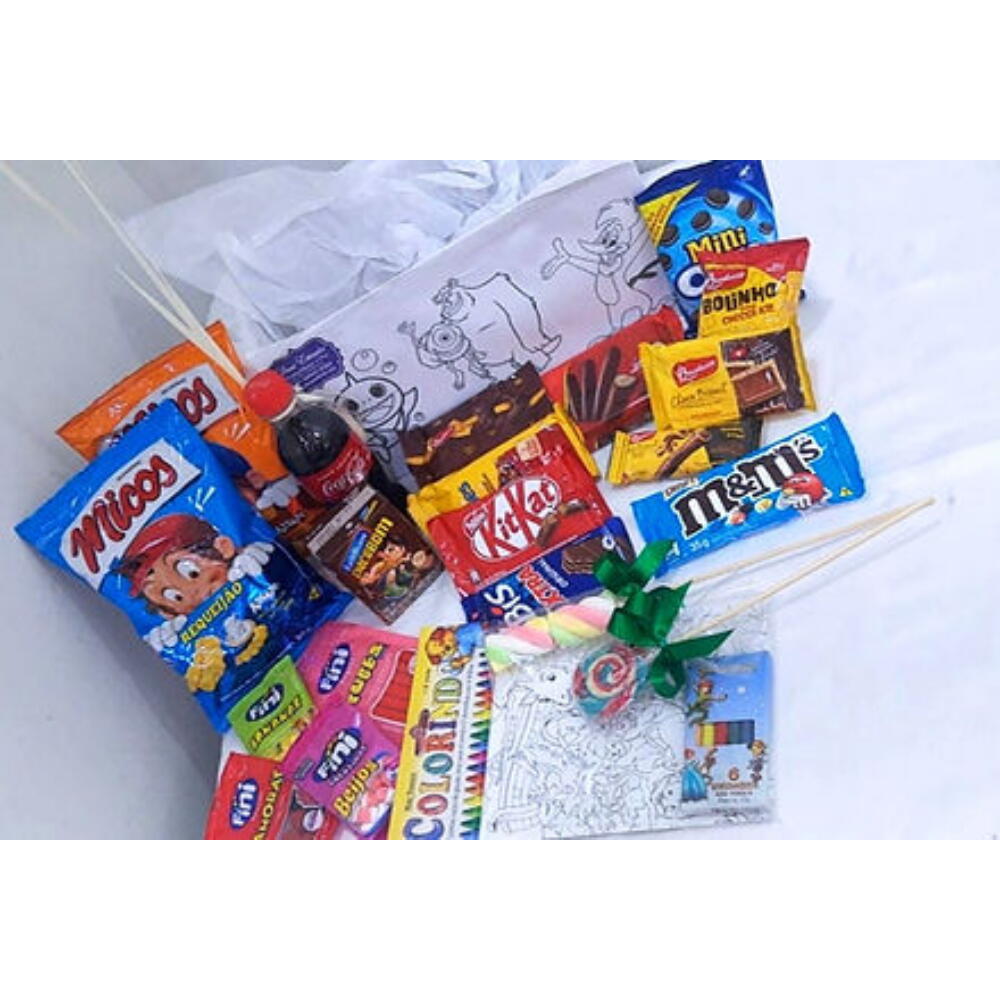 pão de mel - 1 un. bolinho - 1 un. cookie - 1 un. todynho - 1 un. salgadinhos variados - 2 un. balas fini - 4 un. mini oreo - 1 un. caixa box para colorir - 1 un. chocolate variados - 4 un. chocotubes - 1 un. coca 200ml - 1 un. livro para colorir - 1 un.