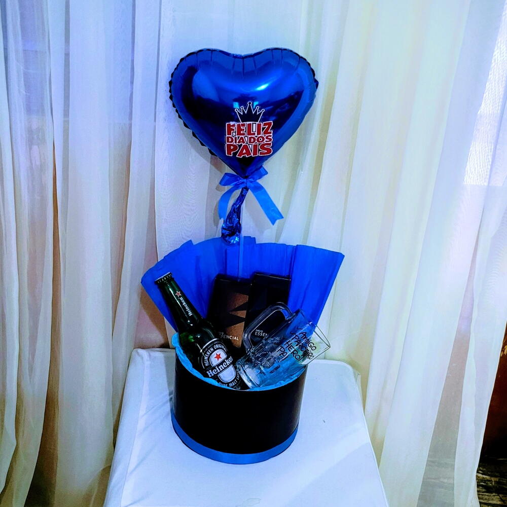long neck heineken - 1 un. embalagem sacola celofane - 1 un. caiacartonada 20x15 - 1 un. balm pós barba essencial natura - 1 un. creme de barbear essencial natura - 1 un. caneca de chopp 300 ml - 1 un. balão metalizado azul 20cm - 1 un. laço se cetim - 3 un.