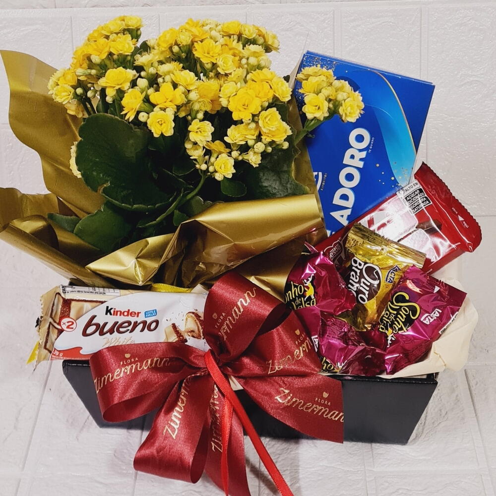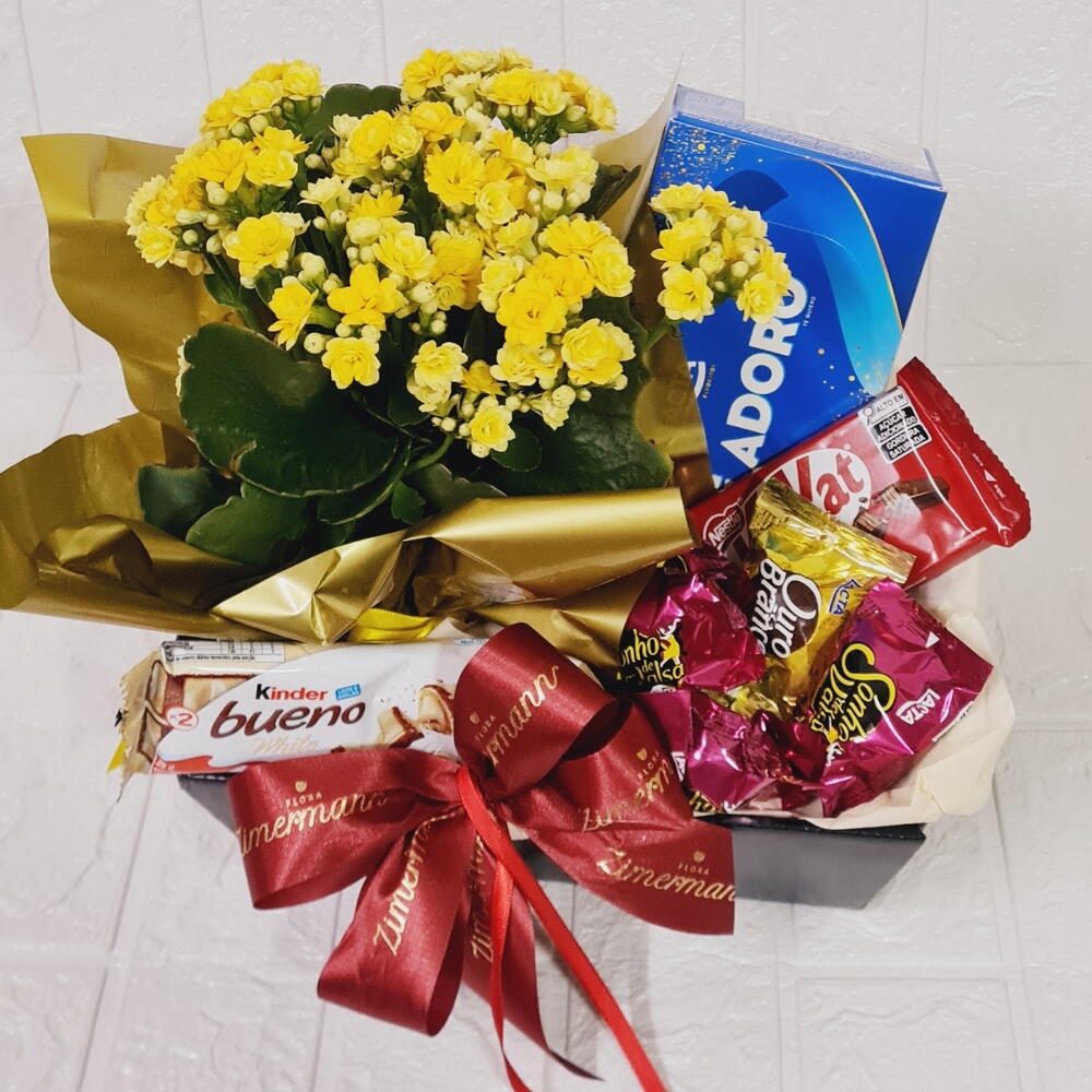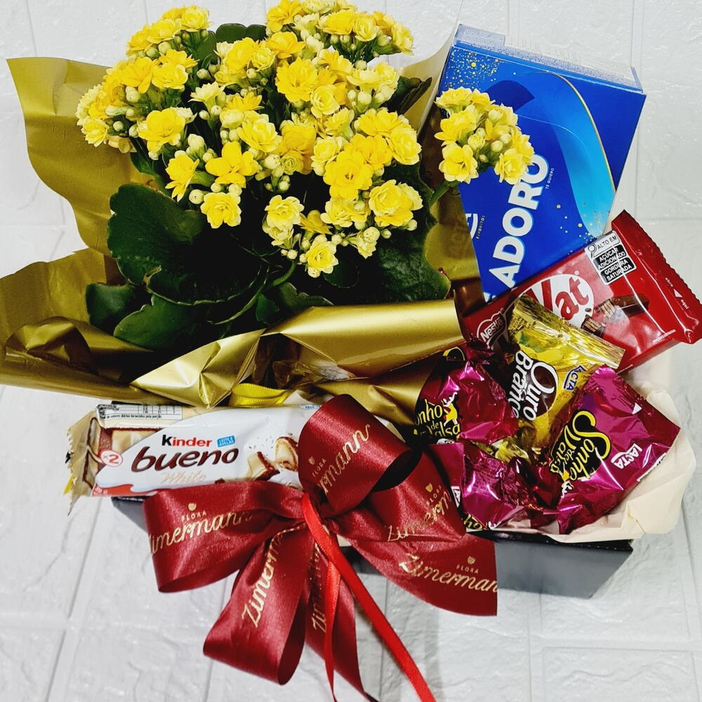 Este impressionante arranjo de flores não é apenas visualmente encantador, mas também repleto de deliciosos chocolates para agradar o paladar. A caixa inclui um Kinder Bueno, quatro bombons atraentes, um KitKat, todos delicadamente arranjados. Além disso, também inclui uma flor fresca e vibrante, a cor da qual será baseada na disponibilidade do dia. Tudo cuidadosamente embalado numa caixa de papelão durável. Para adoçar ainda mais as coisas, vem com uma caixa de bombom variado que poderá ser da Lacta, Nestlé ou Garoto, tornando-se um presente impressionante para qualquer ocasião.