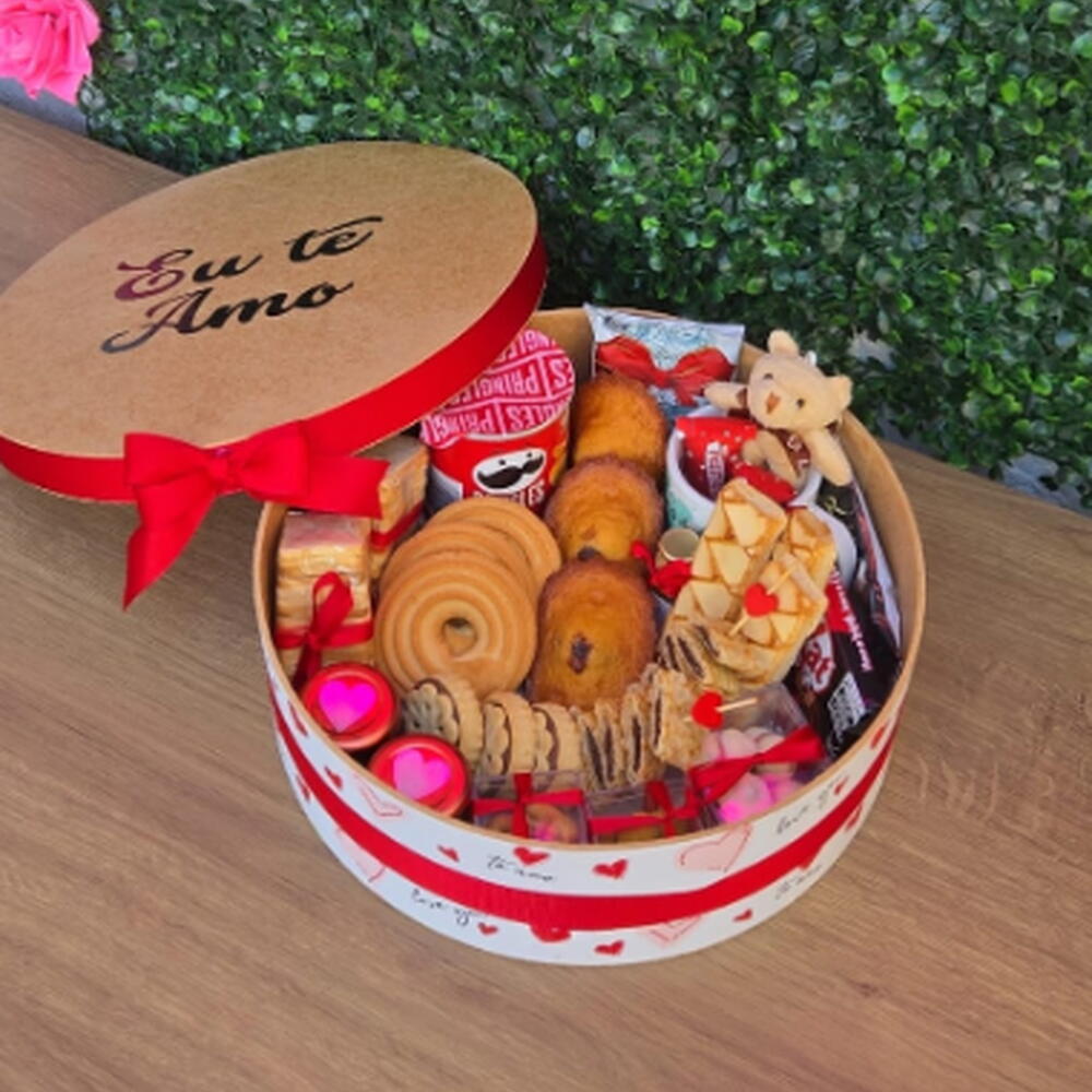 caneca - 1 un. ursinho - 1 un. pringles - 1 un. box redonda - 1 un. tipos de biscoitos - 5 un. laço em cetim - 1 un.