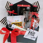 Este presente refinado com bebida é o complemento perfeito para qualquer ensolarada tarde de lazer. Dentro de uma elegante caixa-envelope, você encontrará um sortimento de cervejas - cinco unidades para ser preciso, incluindo duas Budweisers, para aguçar seu paladar. Não é apenas sobre a cerveja, esta caixa de presente também inclui uma taça de cerveja com um adesivo especial para o Pai, tornando-o um presente adorável para datas comemorativas. Para acompanhar a bebida, temos uma deliciosa seleção de petiscos: um pacote de Kinder Bueno para uma dose de doçura, um pacote de Grissinis para algo crocante, amendoim torrado para niblar, e um frasco de creme de Brie para um toque gourmet. Enfeitada com três laços elegantes, esta caixa de presente é tão agradável de ver quanto de degustar!