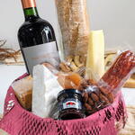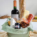 vinho - 750 ml caixa cartonada - 1 un. geleia francesa - 1 un. baguete - 1 un. cartão de mensagem - 1 un. porção de castanhas - 1 un. porção de damascos - 1 un. laço em cetim - 1 un. porção de amêndoas defumadas - 1 un. salame inteiro tipo italiano - 1 un. porção queijo tipo gruyère - 1 un. porção queijo tipo brie - 1 un. pastinha salgada - 1 un.