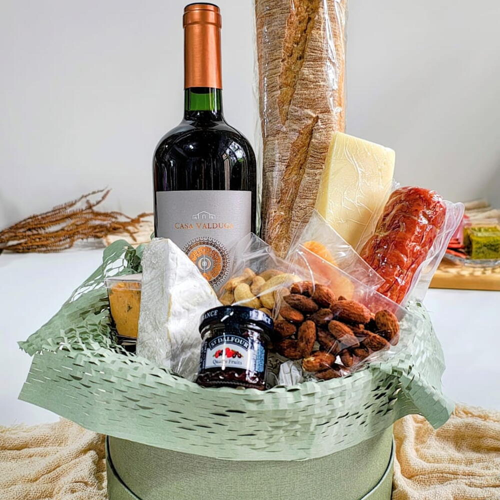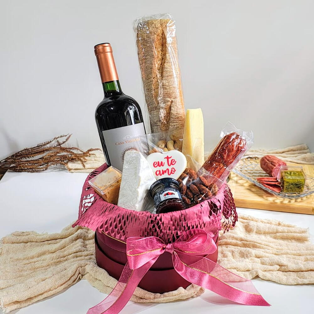 vinho - 750 ml caixa cartonada - 1 un. geleia francesa - 1 un. baguete - 1 un. cartão de mensagem - 1 un. porção de castanhas - 1 un. porção de damascos - 1 un. laço em cetim - 1 un. porção de amêndoas defumadas - 1 un. salame inteiro tipo italiano - 1 un. porção queijo tipo gruyère - 1 un. porção queijo tipo brie - 1 un. pastinha salgada - 1 un.