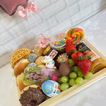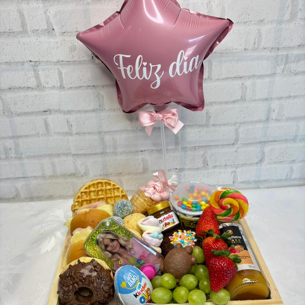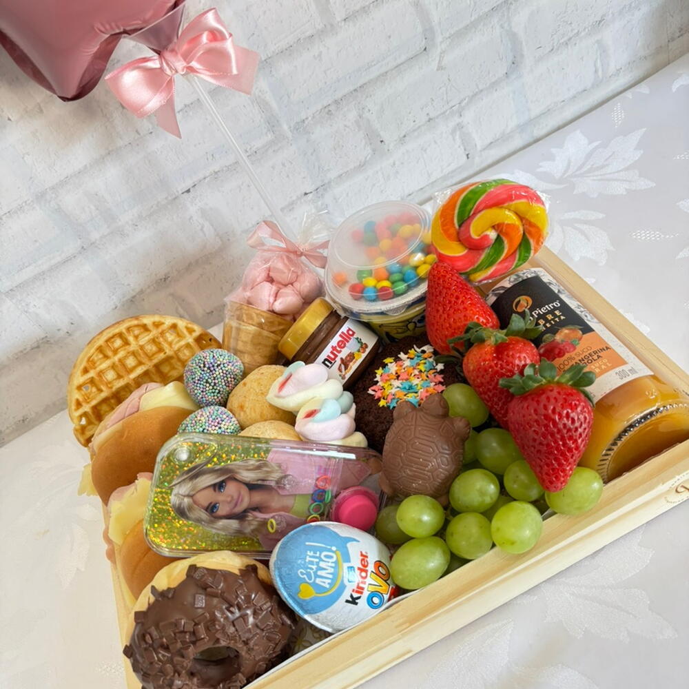 kinder ovo - 1 un. pães de queijo - 2 un. waffles - 1 un. brigadeiros gourmet - 2 un. frutas frescas - 2 un. mini nutella - 1 un. suco 300ml - 1 un. balão feliz dia - 1 un. pães sortidos - 4 un. guloseimas diversas - 6 un. donutt - 1 un. brinquedo surpresa - 1 un.