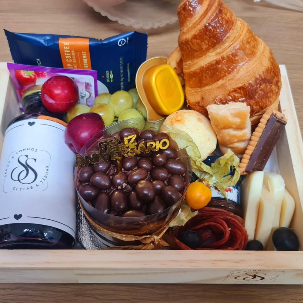 Celebre com sabor e encanto! Nossa caixa de aniversário individual vem com café, suco, pães de queijo, croissant, frios, geleia , mini bolo e todos os detalhes para um parabéns completo — balão, velinha e cartão. Um mimo cheio de carinho, perfeito para tornar o dia de alguém inesquecível. O QUE VEM NA CESTA: CROISSANT DE MANTEIGA PAES DE QUEIJO RECHEADOS COM CATUPIRY WAFFLE BOLO NAKED CAKE BISCOITOS DOCES TORRADAS FINAS QUEIJO MINAS 1 CHARCUTARIA (LOMBO OU SALAME) FRUTAS DA ESTAÇÃO GELEIA PORÇÃO DE NUTS SUCO DE UVA INTEGRAL 300 ML CAFÉ DRIPP COFFEE CHÁ CREAM CHEESE SACHÊ DE MANTEIGA MONTADA EM NICHO PINUS 24 X 16 BALÃO METALIZADO EM FORMATO DE CORAÇÃO OU MINI BUBBLE PERSONALIZADO VELINHA Envie nas observações a frase e o tipo da balão para pesonalização metalizado de coração ou bubble transparente