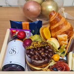 croissant - 1 un. balao personalizado - 1 un. chá - 1 un. waflle - 1 un. manteiga sache - 1 un. biscoitos doces porção - 1 un. pao de quejo recheado catupiry - 1 un. cream cheese porção 40 gr - 1 un. charcutaria porção - lombo ou salame - 1 un. queijo minas porção - 1 un. frutas da estação porção 1 - 1 un. mini bolo naked cake 250 gr (cenoura ou chocolate com brigadeiro) - 1 un. vela de aniversario - 1 un. geleia 40 gr - 1 un. suco 300 ml uva - 1 un. cafe drip coffe - 1 un.