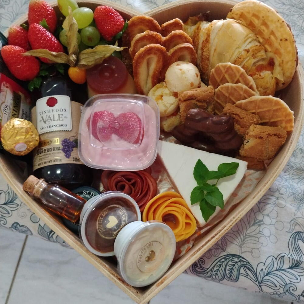 queijo - 1 un. frutas - 2 un. croissant - 1 un. iogurte - 1 un. suco - 1 un. pão de queijo - 3 un. cream cheese - 45 gr. pudim - 1 un. biscoitos finos - 3 un. queijos brie - 1 un. wafle - 1 un. biscoitos palmier - 3 un. charcutaria - 1 un. café drip coffe - 1 un. nutella ou doce de leite fracionado - 45 gr.