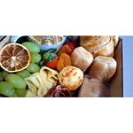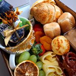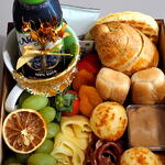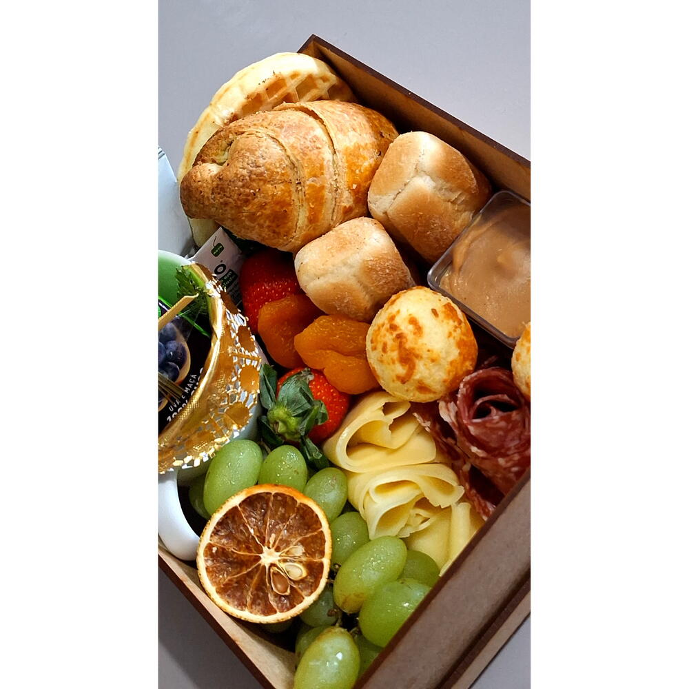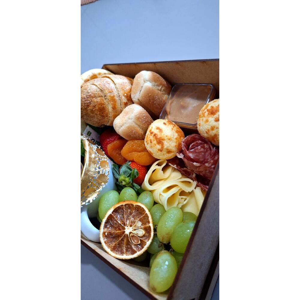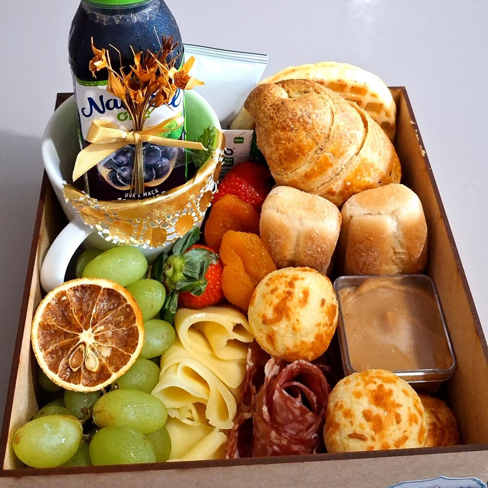 caixa decorada com laço de fita - 1 un. sache de chá – 2g - 1 un. croassant recheado - 1 un. porção de morango - 1 un. pão de queijo. - 3 un. suco integral (uva ou laranja) - 1 un. salame em formato de rosa - 1 un. porção de uva sem caroço - 1 un. waffer pão de queijo - 1 un. xicara porcelana branca - 1 un. porção de mussarela - 1 un. doce de leite potinho de acrilico - 1 un. drip coffe três corações - 1 un. bisnaga artesano pullman - 2 un.
