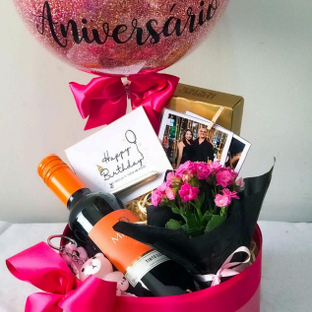 ferrero rocher - 1 un. fotos polaroide - 2 un. vinho 375ml - 1 un. flor de vaso - 1 un. chaveiro fofo - 1 un.