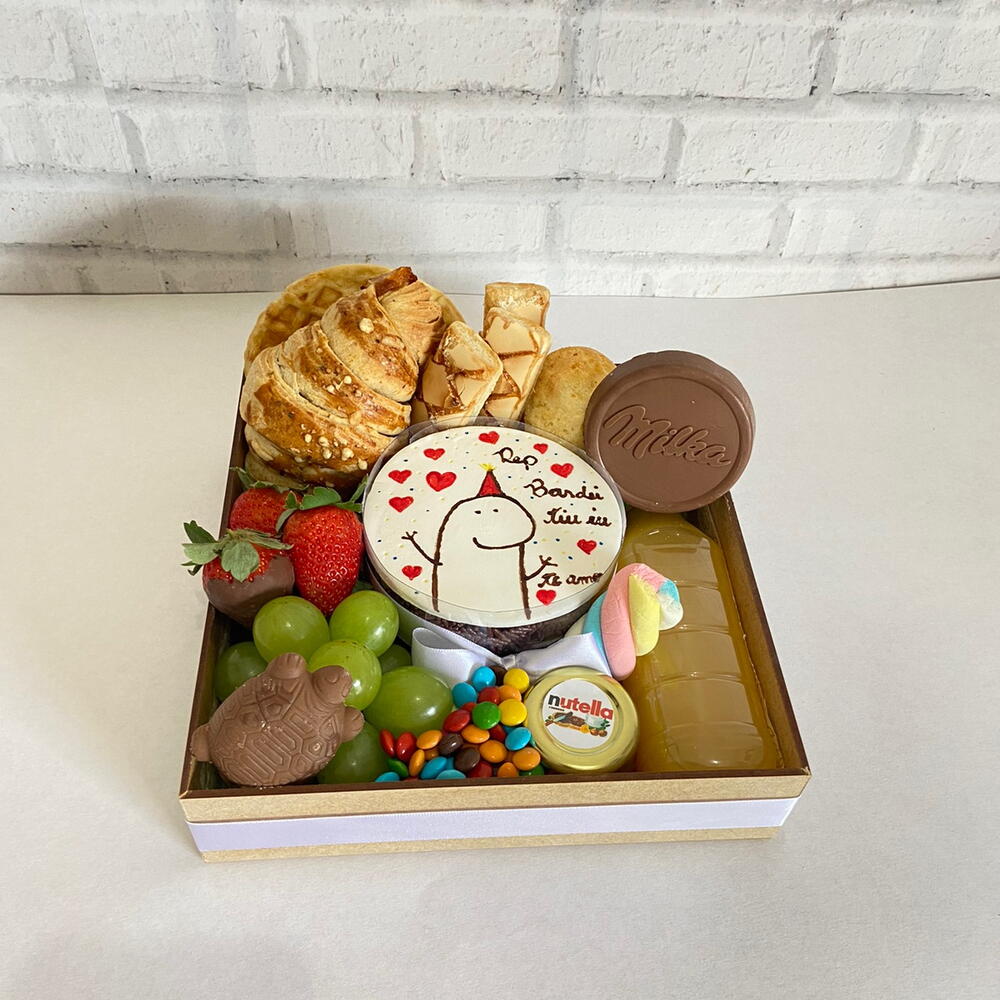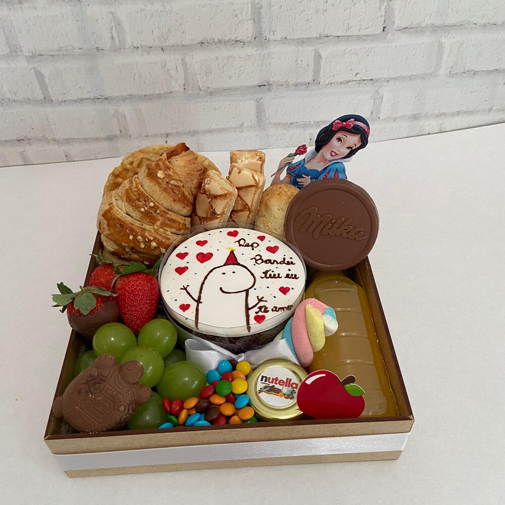 chocolate - 1 un. croissant - 1 un. suco - 1 un. pães de queijo - 1 un. marshmallow - 1 un. waffle - 1 un. morangos frescos - 1 un. uvas frescas - 1 un. cartão dedicatória - 1 un. tortuguita - 1 un. morango com chocolate - 1 un. confete - 1 un. caixa em madeira mdf 20x20 - 1 un. mini bolo bento recheado - 1 un. biscoitos folhados importado - 1 un.