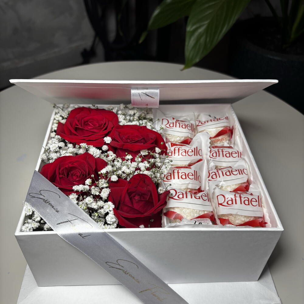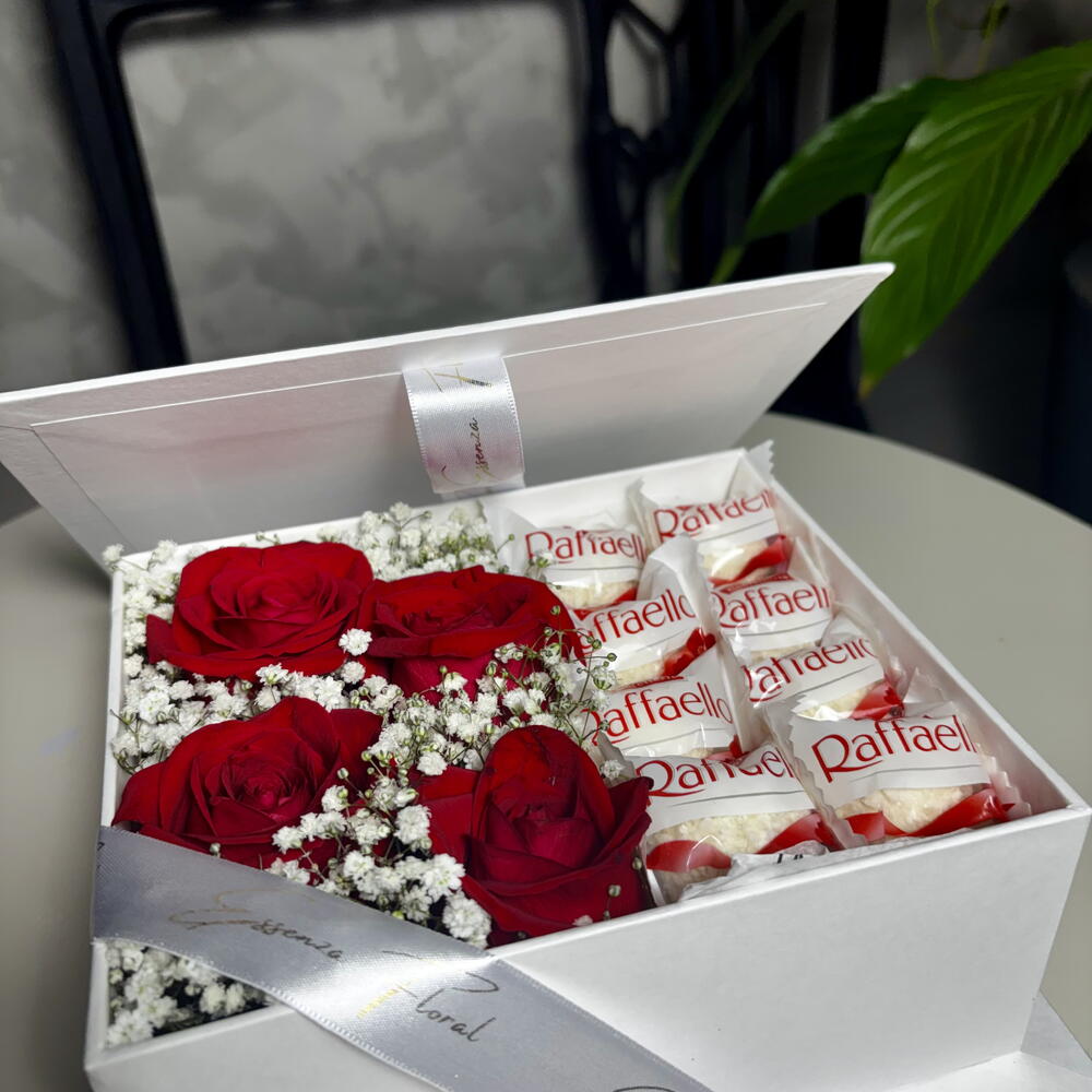 Este box de flores é uma combinação perfeita de beleza e doçura. Composto por 4 encantadoras rosas vermelhas, 1 unidade de folhagens e complementos para adicionar aquele toque de naturalidade e frescor ao conjunto. A surpresa fica ainda melhor com a inclusão de 8 deliciosas unidades de Raffaello, garantindo uma explosão de sabor. Tudo isso cuidadosamente embalado numa elegante caixa box decorada, a qual é finalizada com um delicado laço para dar aquele toque final de sofisticação. Um presente verdadeiramente luxuoso e pensado nos mínimos detalhes, para ocasiões realmente especiais.