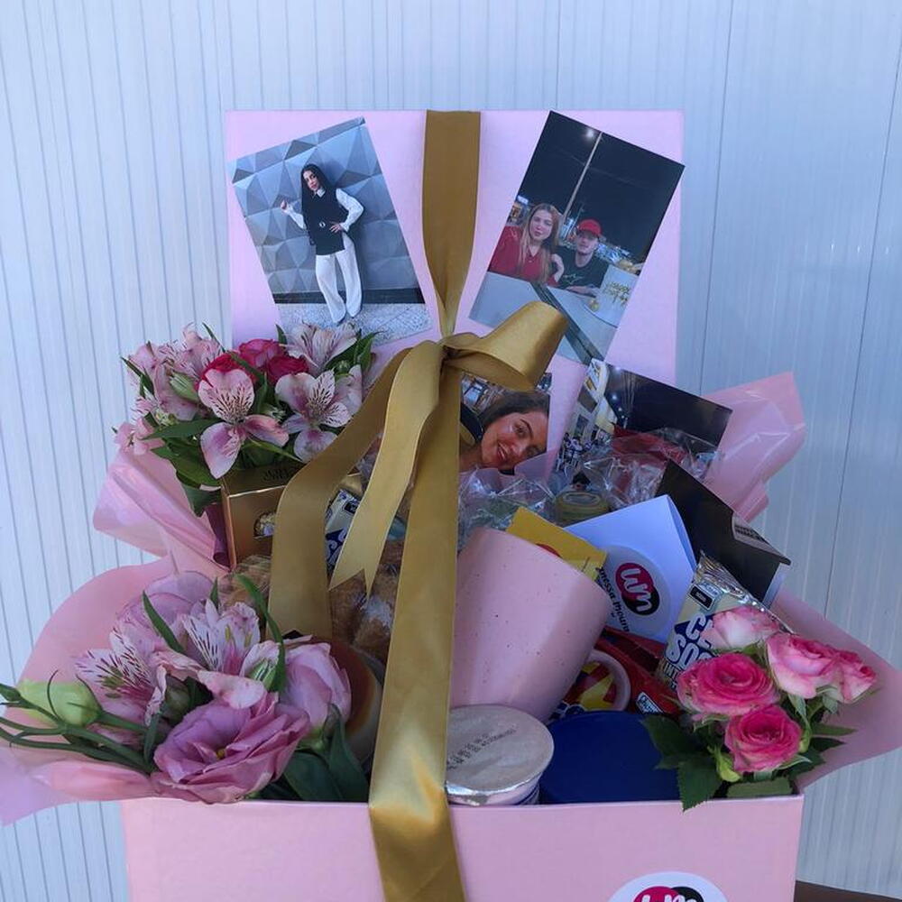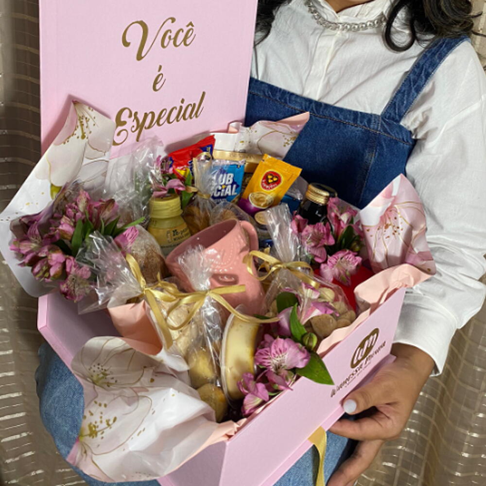 caixa de chocolate - 1 un. caneca - 1 un. suco - 1 un. cesta - 1 un. laço - 1 un. achocolatado - 1 un. biscoito salgado - 2 un. biscoito doce - 1 un. fotos - 4 un. croissants - 4 un. embalagem celofane - 1 un. flores decorativas - 1 un. pudim de leite - 1 un. biscoito fino - 1 un. sachê de cappuccino solúvel - 1 un. tipo de pães - 2 un. logurte - 1 un. bolinhos de queijo - 3 un. bolo vulcão - 1 un. delicias de goiaba - 1 un.