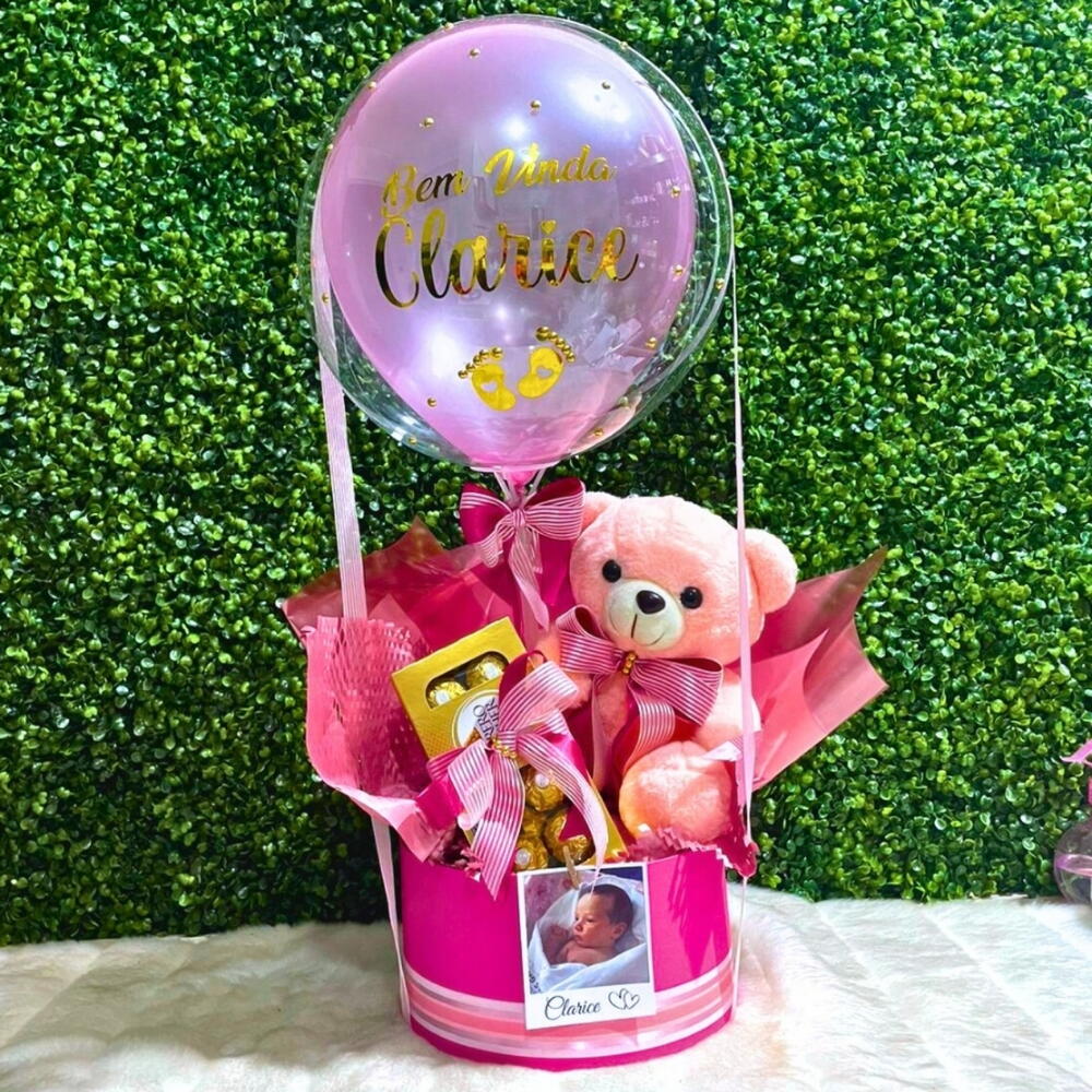 embalagem - 1 un. ferreiro rocher - 1 un. balão bubble personalizado - 1 un. caixa box cartonada - 1 un. urso articulado - 1 un. laço artesanal - 1 un. carta cortesia - 1 un. foto polaridade - 1 un.